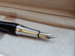 The pen is of metal construction, with a glossy black lacquer finish to cap and barrel and a shiny chrome section. The section has a distinctive pattern of engraved wavy lines giving the impression of diamond-shaped cross hatching, making this a very pretty pen.