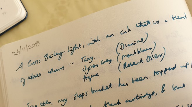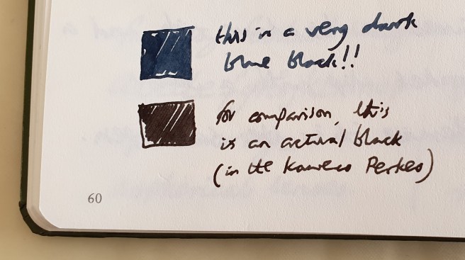 I am impressed with the Permanent Blue. At Christmas my neice gave me an A5 soft cover journal, from “Agenzio by Paperchase.” As is my custom, I first tried out a range of different inks (from my currently inked pen cups) on the back page, to see which were best suited. The paper is pleasant to write on but is prone to bleedthrough with many of my inks. However I found that with Montblanc Permanent Blue, there was no bleedthrough and also hardly any show through, or ghosting. Likewise with Sailor Kiwa-guro permanent black and so these will be my choices for this note book.