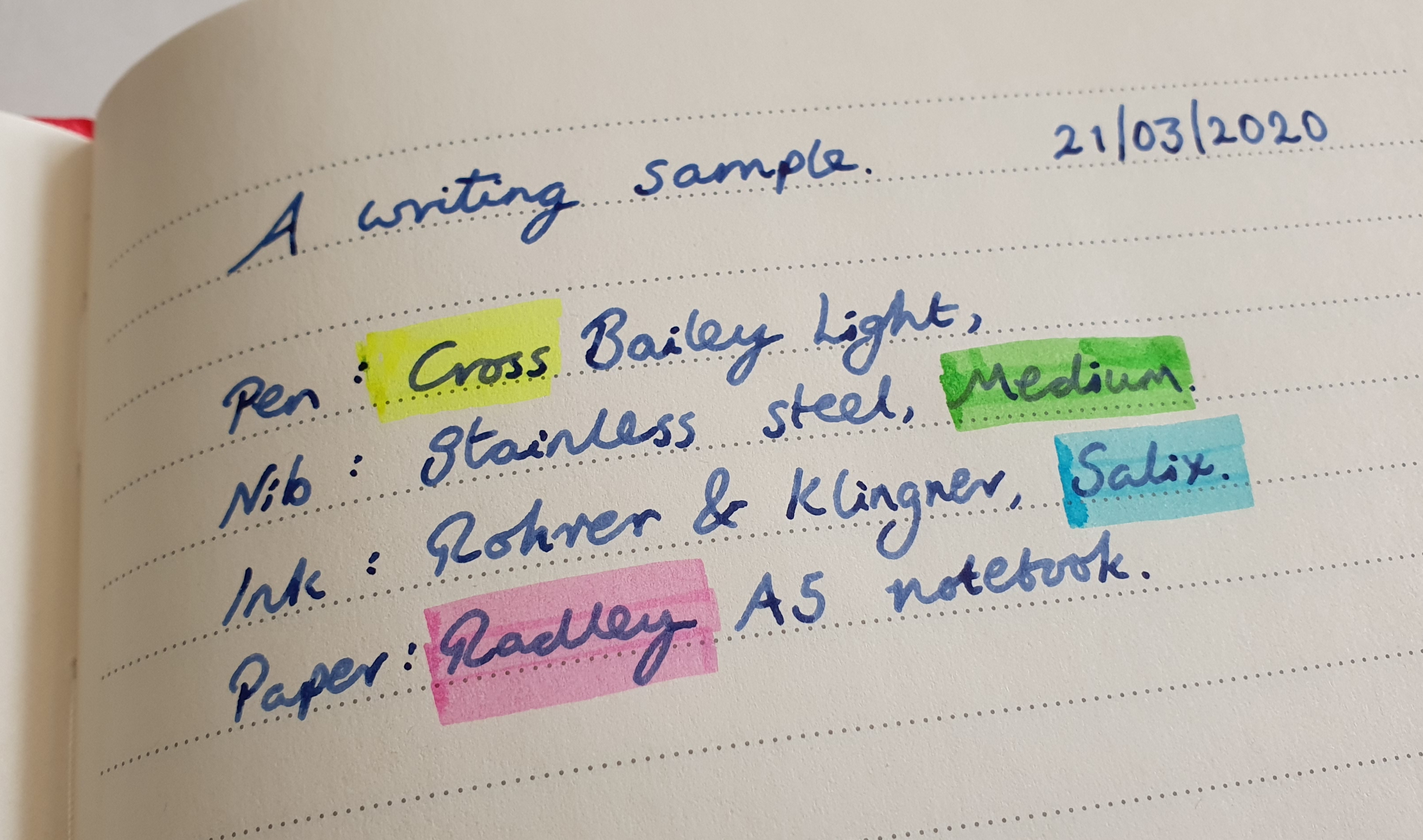 “What’s your favourite pen?” I said that many addicts would answer “My next one” which is only partly a joke. It seems that no matter how many fountain pens you have, you are always after the next one, a sign of obsession. I did then try to answer, but said it was difficult to say which was the favourite. I could perhaps try to list the favourite from each brand that I own, to narrow it down. I told Esther that lately I had discovered a pen called the Cross Bailey Light, which was inexpensive, comfortable and wrote well and had gone on to buy six of these, one in each of the available colours.