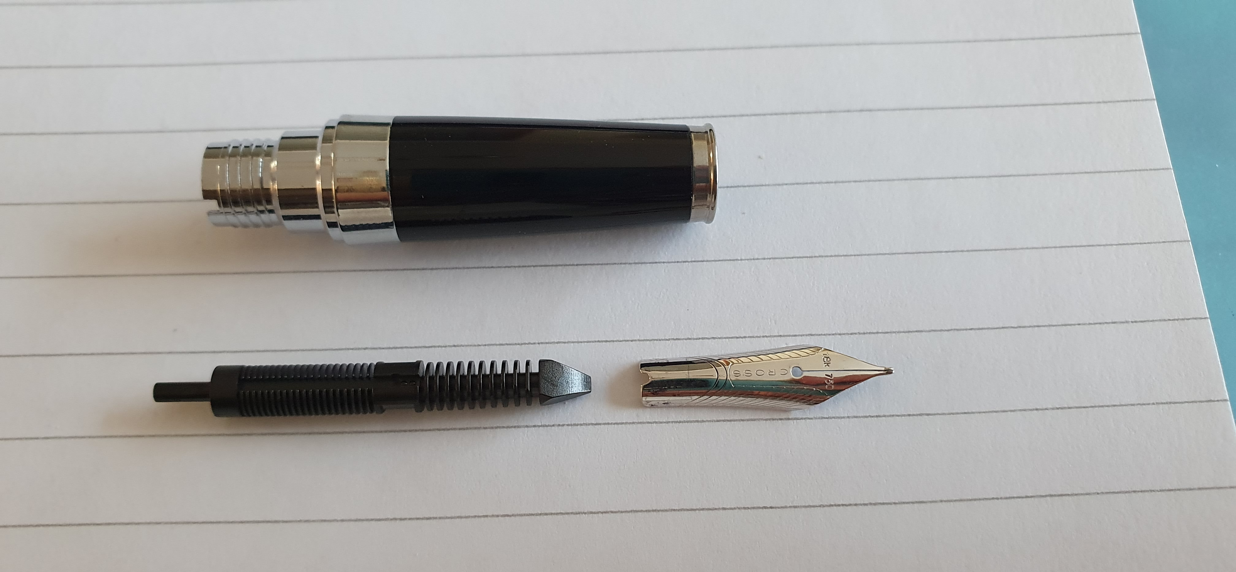 The nib is attractively decorated with CROSS, 18k 750 and with lines running down each side, perhaps to suggest the vanes of a feather, which ties in with the arrowhead style of the pocket clip. The nib grade of M for medium is found on one side of the nib, rather like on a Sailor or a Pilot nib.