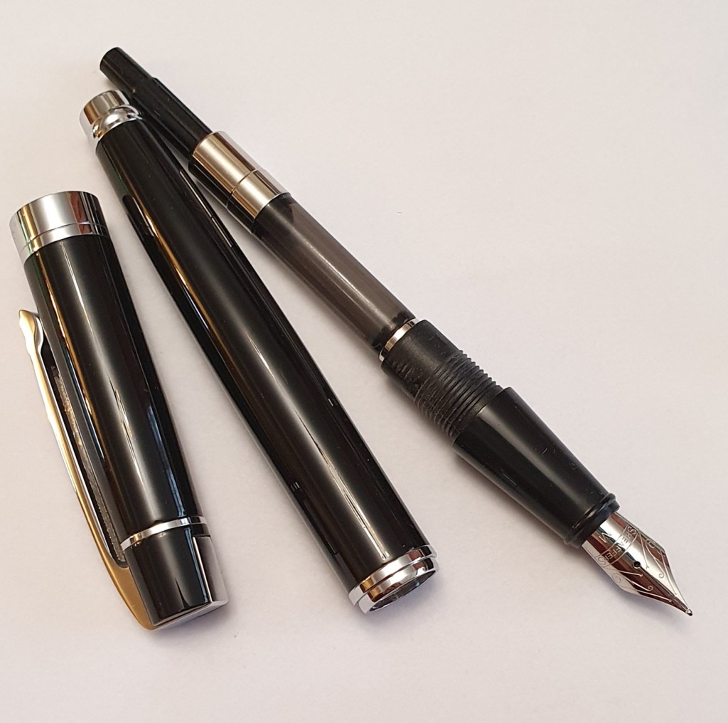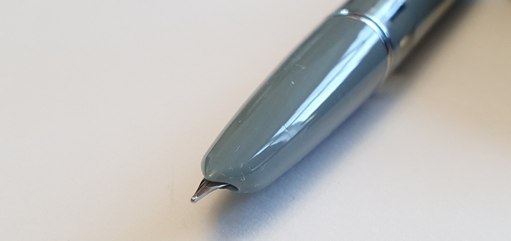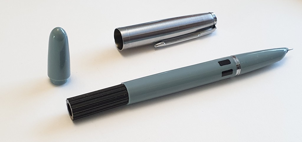 The Wing Sung 601 is a Chinese homage to the classic but long- discontinued Parker 51 vacumatic but with a few differences such as a stainless steel nib, ink windows and a price tag (in this instance) of around £7.50. It came with a small container of silicone grease, (the container being based, confusingly, on a cartridge- converter which has no place in this pen). I prefer to use a thicker silicone grease, which I purchased from a diving shop. My pen did not come with the necessary wrench to unscrew the plunger, but I received one later with the Wing Sung 601A and it also fits the 601.