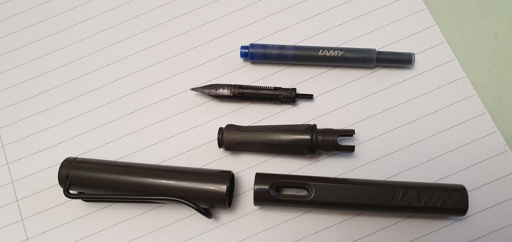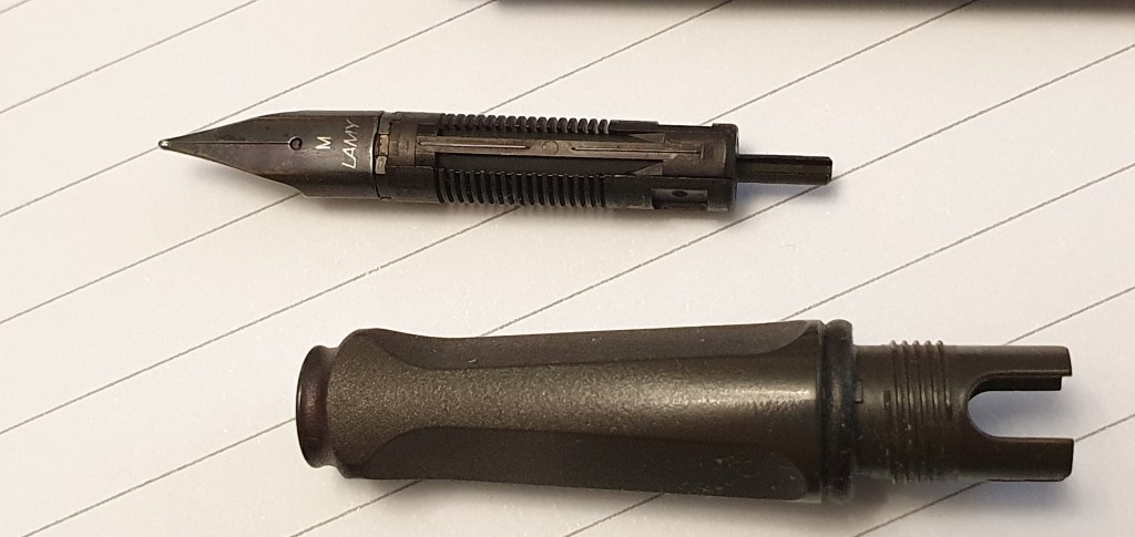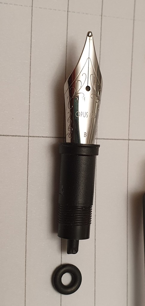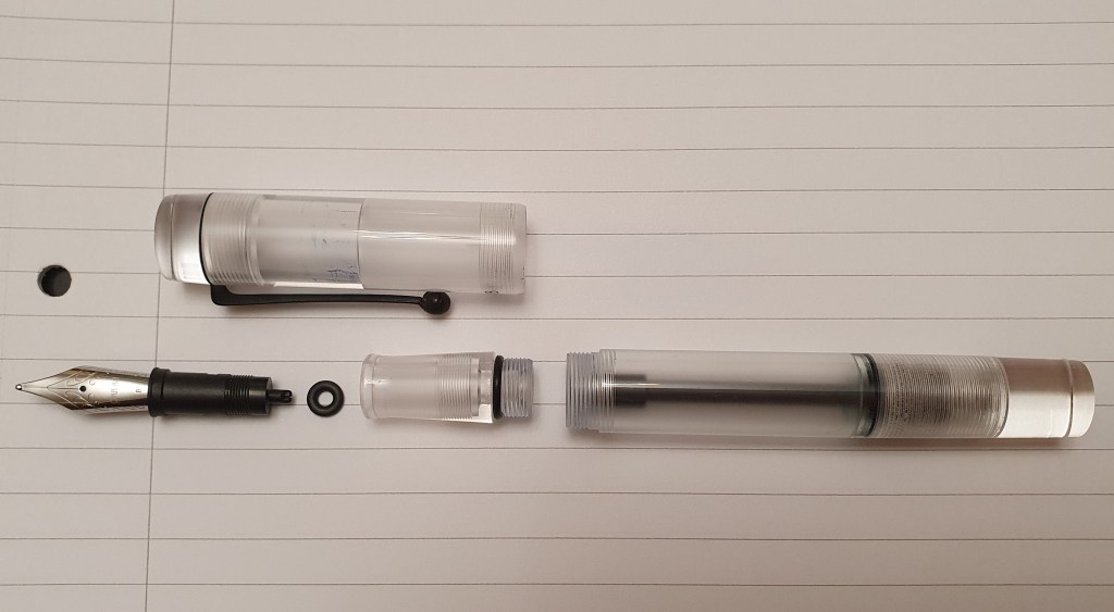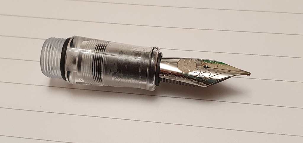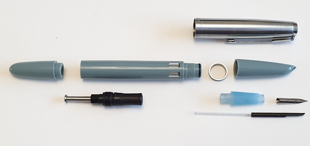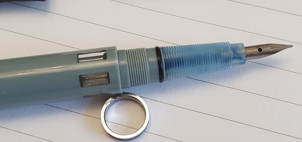 2. Unscrew the front shell, to expose the ink collector, nib and feed. Put the metal cap-retaining ring aside safely. It does not matter which way round it goes back.