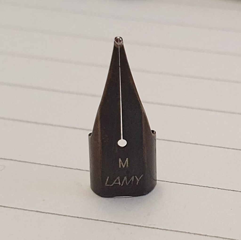 4. Grip the tiny, tubular nib (and the black plastic feed inside) firmly and pull them out of the ink collector. They might be tight and difficult to grip. Be careful not to distort the nib or damage the ink collector. Note: to reduce risk of damage, this stage could be skipped and the assembled nib, feed and ink collector instead be placed in water to soak.