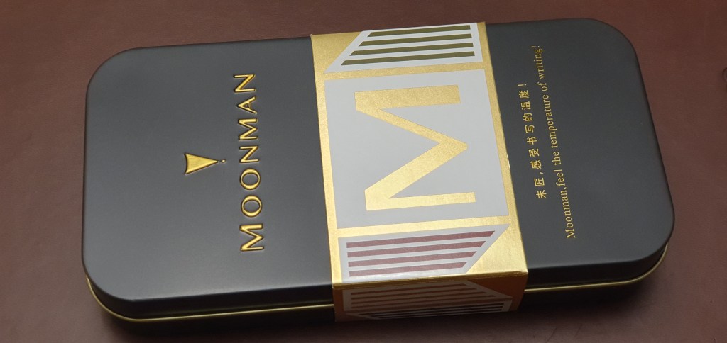 The pen comes in a nice black tin with gold lettering, held shut by a cardboard sleeve, with a nib motif and an M for Moonman.