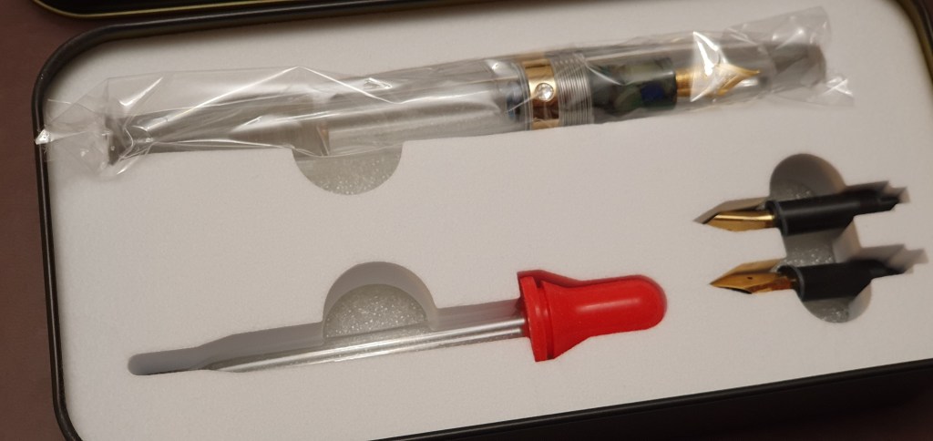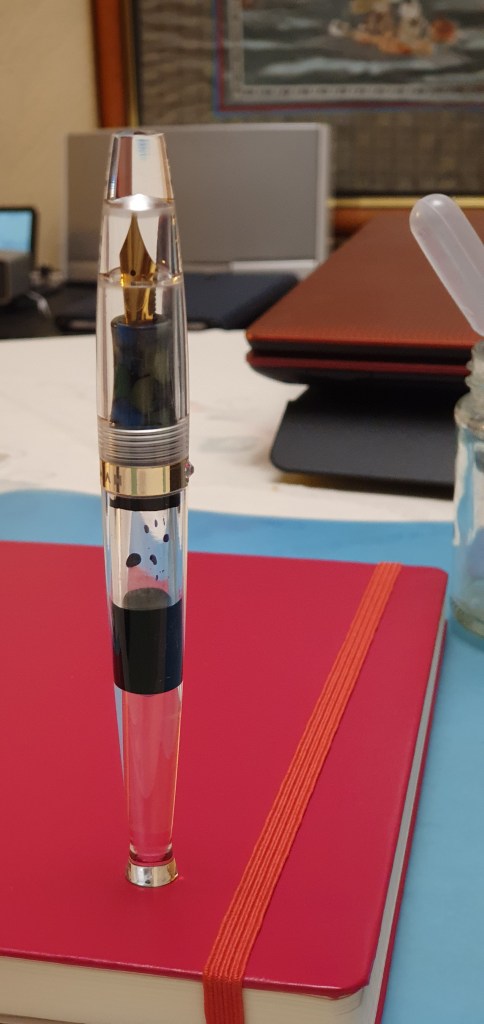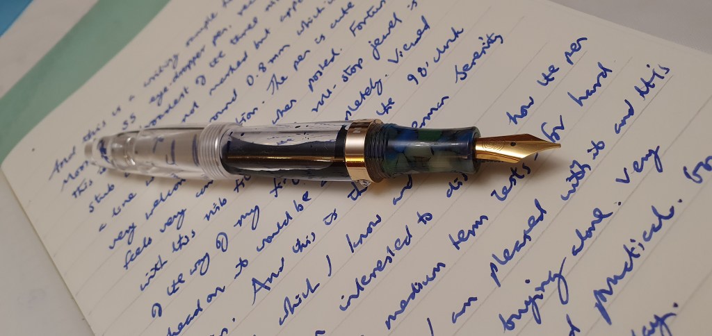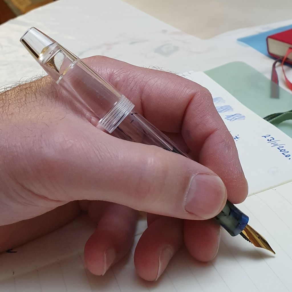 That’s a really interesting pen. A lot of demonstrator/clear pens don’t quite do it for me, perhaps because the workings inside the barrel feel too busy (it’s what keeps me from trying a TSWBI), but this eyedropper filled pen just looks so good. It is useful, too, to read your experience with the nibs. And you can’t beat a photo of a pen resting on a hand-written page!