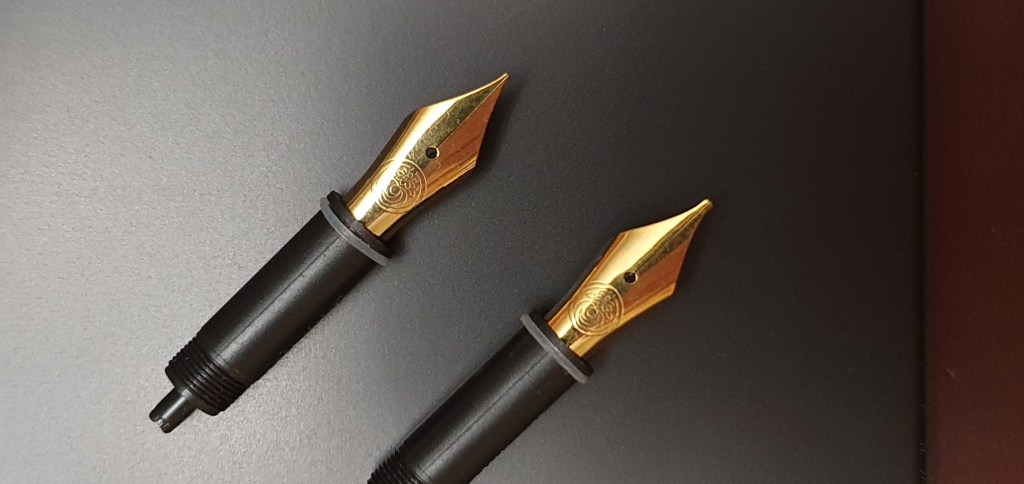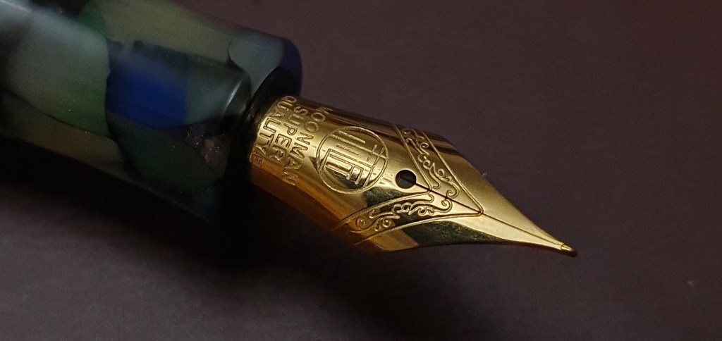 The Broad nib (again with only the floral pattern in a circle and no markings) is an Oblique. Looking at the face of the nib, tip upwards, the tip slants downwards to the left about 15 degrees and is what I believe is called a Left Foot Oblque, looking like a left foot. It produces a line of roughly 0.6 – 0.8mm maximum width, which is lovely.