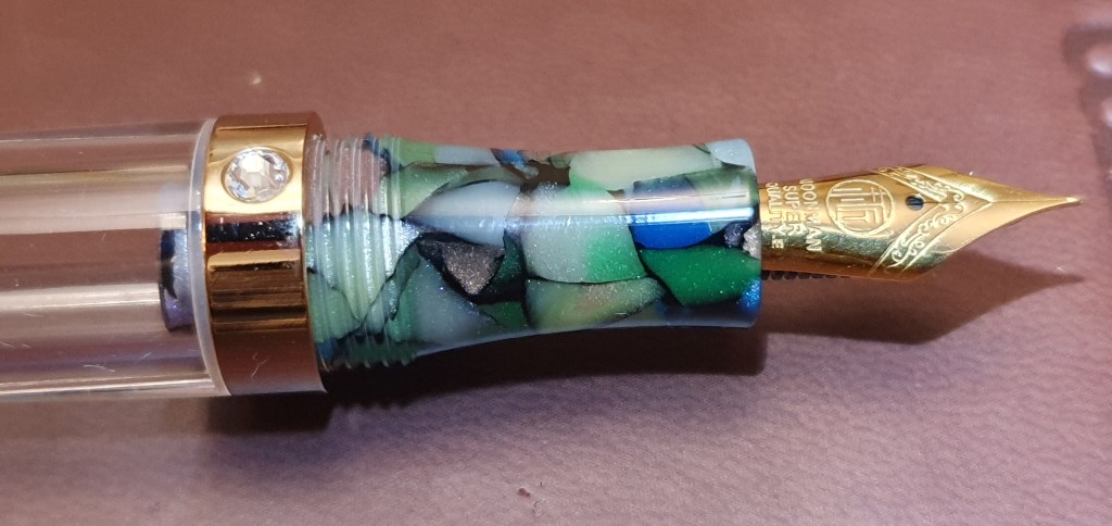 This is a clear, acrylic pen, with a screw on cap (taking three complete turns), no pocket clip but a jewel-like roll stop set in a metal band on the barrel. The band has the name MOONMAN laser-etched against the shiny background. The grip section is comfortably shaped with a very slight hour-glass contour and is in a patterned acrylic with a crazy-paving effect, in a mixture of colours – green, blue, purple, white and brown against a black background. I thought it looked a bit incongruous at first, as though it was for a different pen but I quite like it now. It comes alive and sparkles under the bright light of a loupe.
