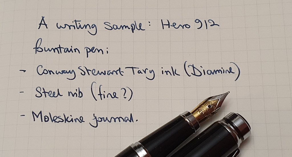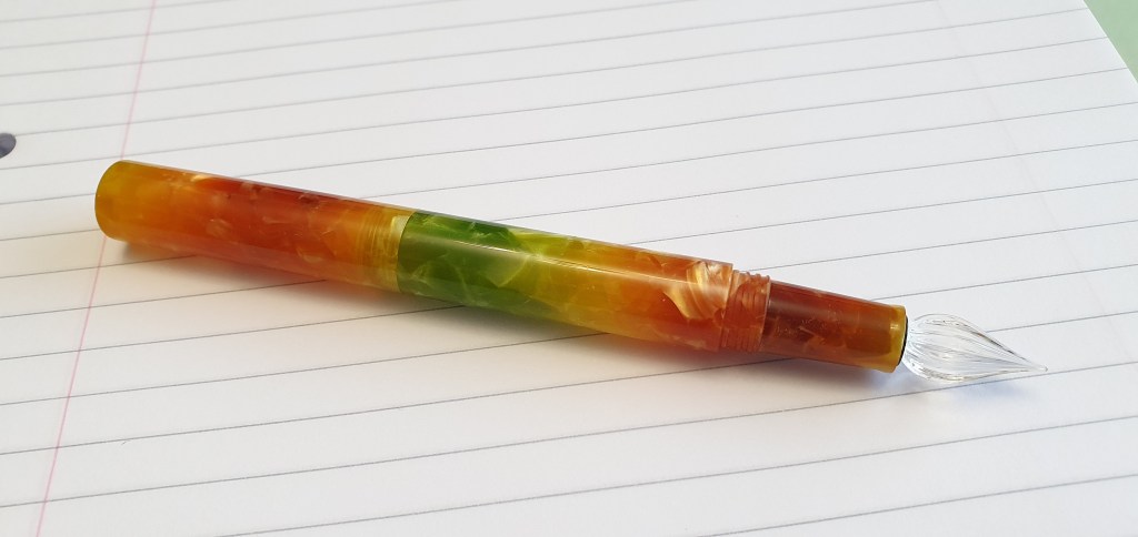 I was excited to try the glass nib. I dipped it in a nearby bottle of Waterman Serenity blue and tried it on a pad of file paper. For a glass nib pen, the result was very pleasing! It wrote with a fine line and a bit of audible feedback but not scratchiness. The ink flowed evenly and I found that I was able to get a good ten lines of A4 paper on one dip!