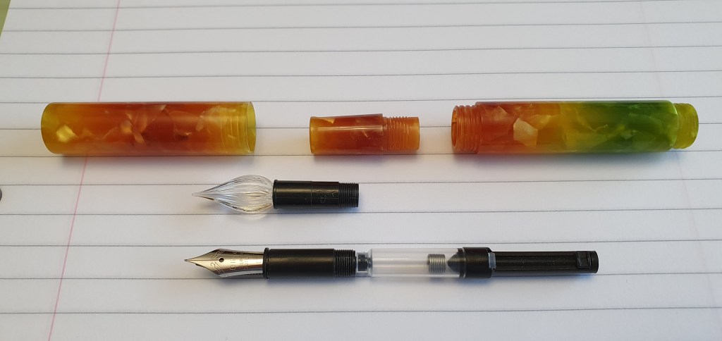 When ordering the pen, there was a choice of four colours: the names of the colours differ somewhat depending where you order but the choices were Black Ice Flowers, Red Ice Flowers (both of which looked like Koi fish colours), New Rose (the pink version like the colour of the pen in Anne’s review) or the one I chose, called Aurora or Autumn Leaf or Gradient Green. I have since learned that the same acrylic can be found on some Pen BBS models too. It is gorgeous blend of colours and in one of the marketing photos, the pen can be can be seen against an avenue of trees in their autumn colours.