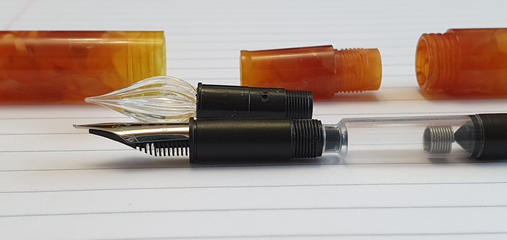 Secondly, apart from chosing your colour, you also have the option to chose a steel nib unit too. There were a few choices but I opted for the “bent nib” or what I would call a fude nib, as something a bit different. Whilst the glass nib has to be dipped in ink, it can easily be unscrewed from the section and replaced with a steel nib, and inked by a cartridge or converter or (although I have not tried), as an eyedropper.