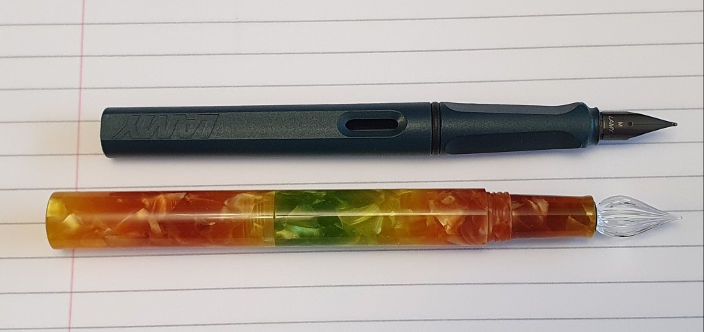 Finally a size comparison of the posted pen against the ubiquitous Safari:-