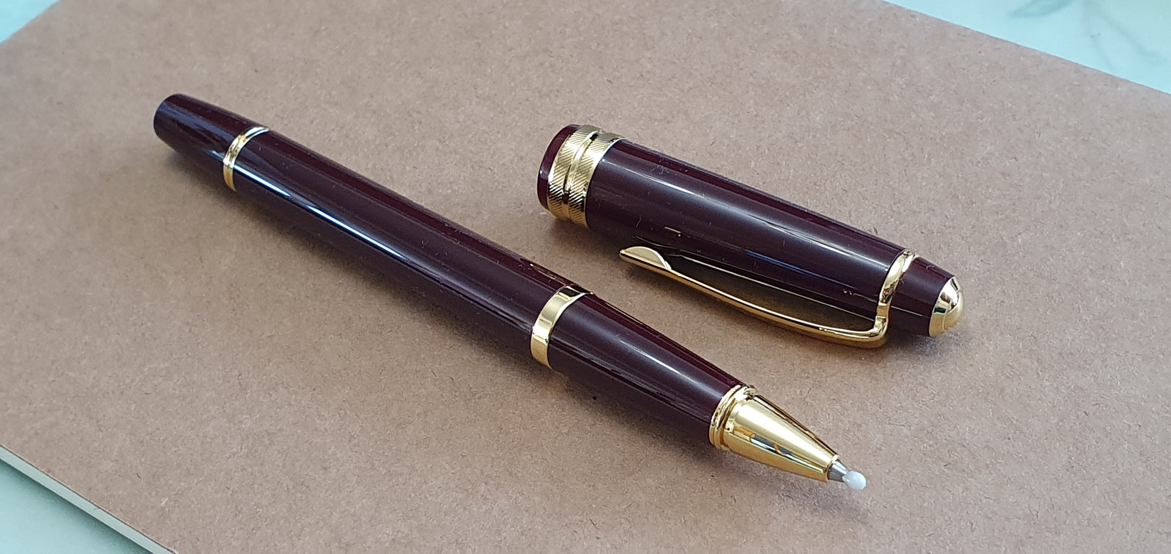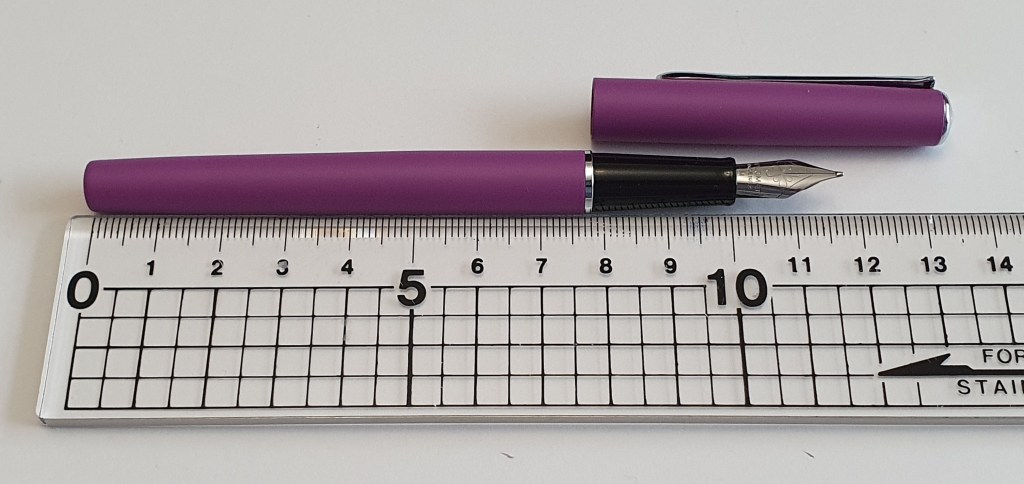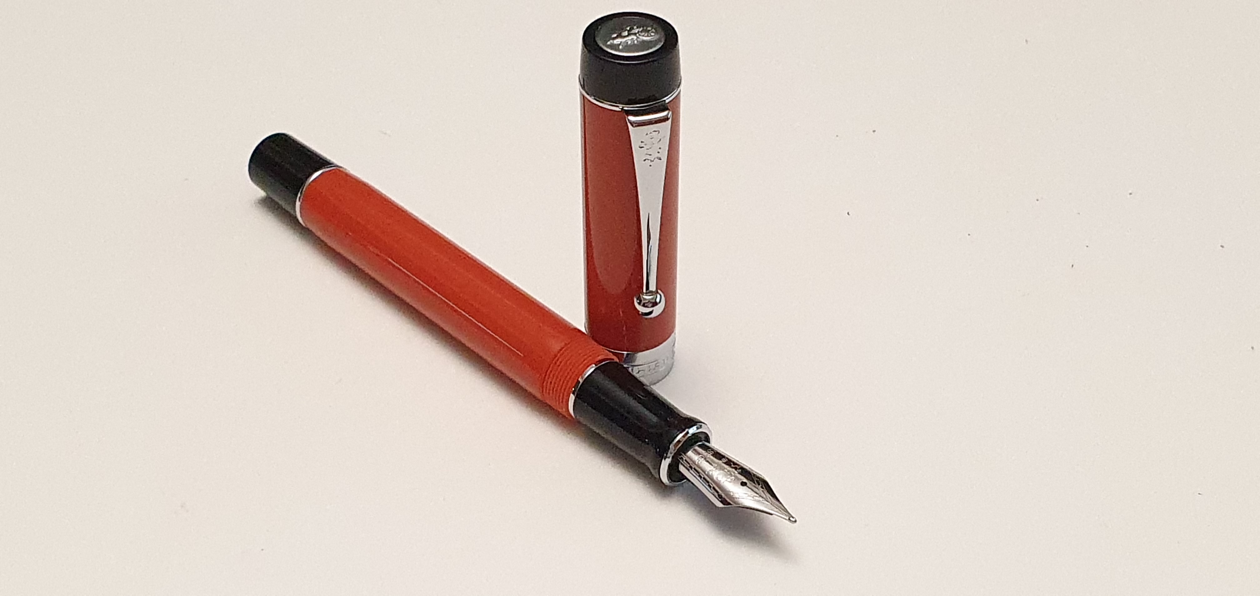 This, a little guilty pleasure, is an homage to the Parker Duofold Centennial, in the classic “big red” body colour and silver coloured nib and fittings. In my defence, I do own two “real” modern Parker Duofolds although of the “International” size, slightly slimmer than the Centennial and so this Jinhao will scratch the itch of having a full size version. It is a cartridge converter pen (unlike the early button fillers of the 1920’s) and aside from lacking the Parker’s current 18k gold nib, otherwise offers a similar shape and size. Jinhao steel nibs have, in my experience, been smooth and enjoyable and I am hoping that ink flow will be consistent in this one. I have not yet inked it up.