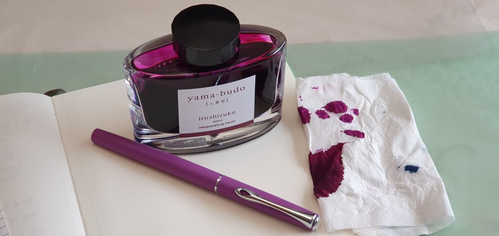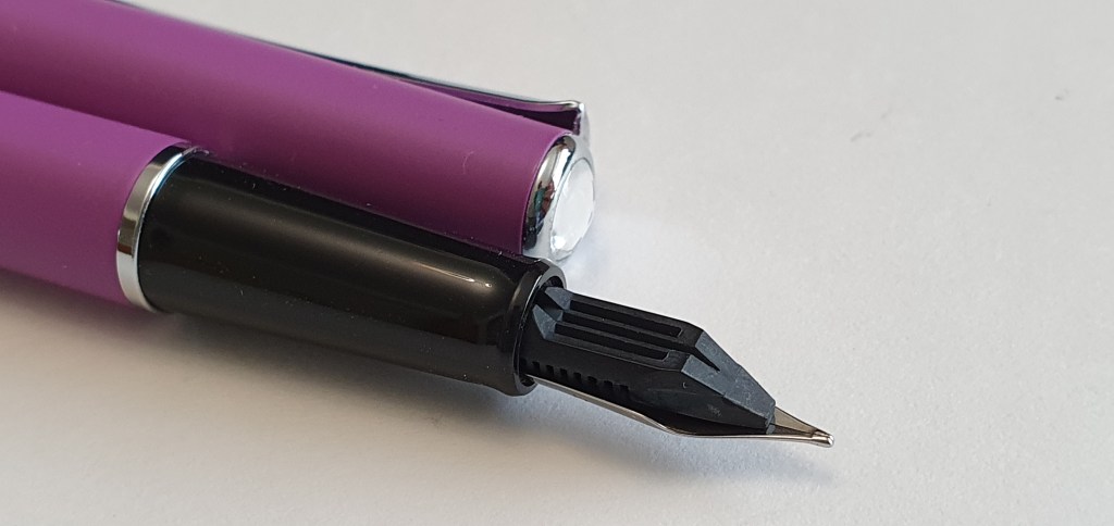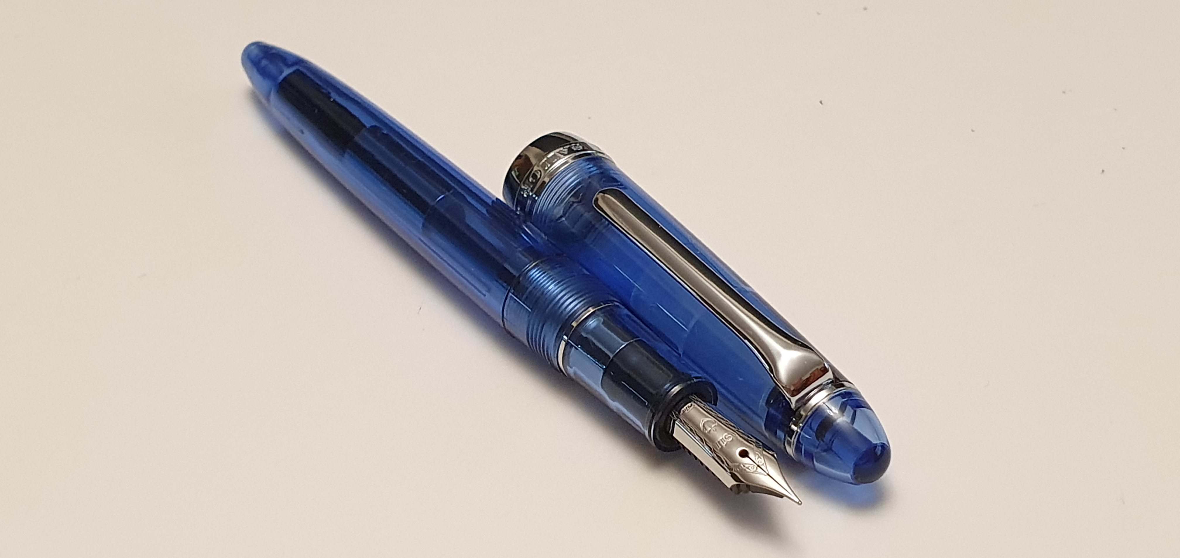 Finally, also spotted on John Twiss’s table, was this Sailor. Sailor nibs are a grade finer than their western equivalents and hence a Sailor fine is like a western extra fine. I was keen to try one – being firm and precise and toothy- but had always hesitated at buying a gold nibbed Pro Gear just to see if I like such a fine nib. However, this steel nibbed pen, in an attractive blue demonstrator version, seemed a perfect opportunity to experience some Sailor fine nibbage at an entry-level price of £35 (and John kindly reduced this as I bought the Diplomat too).