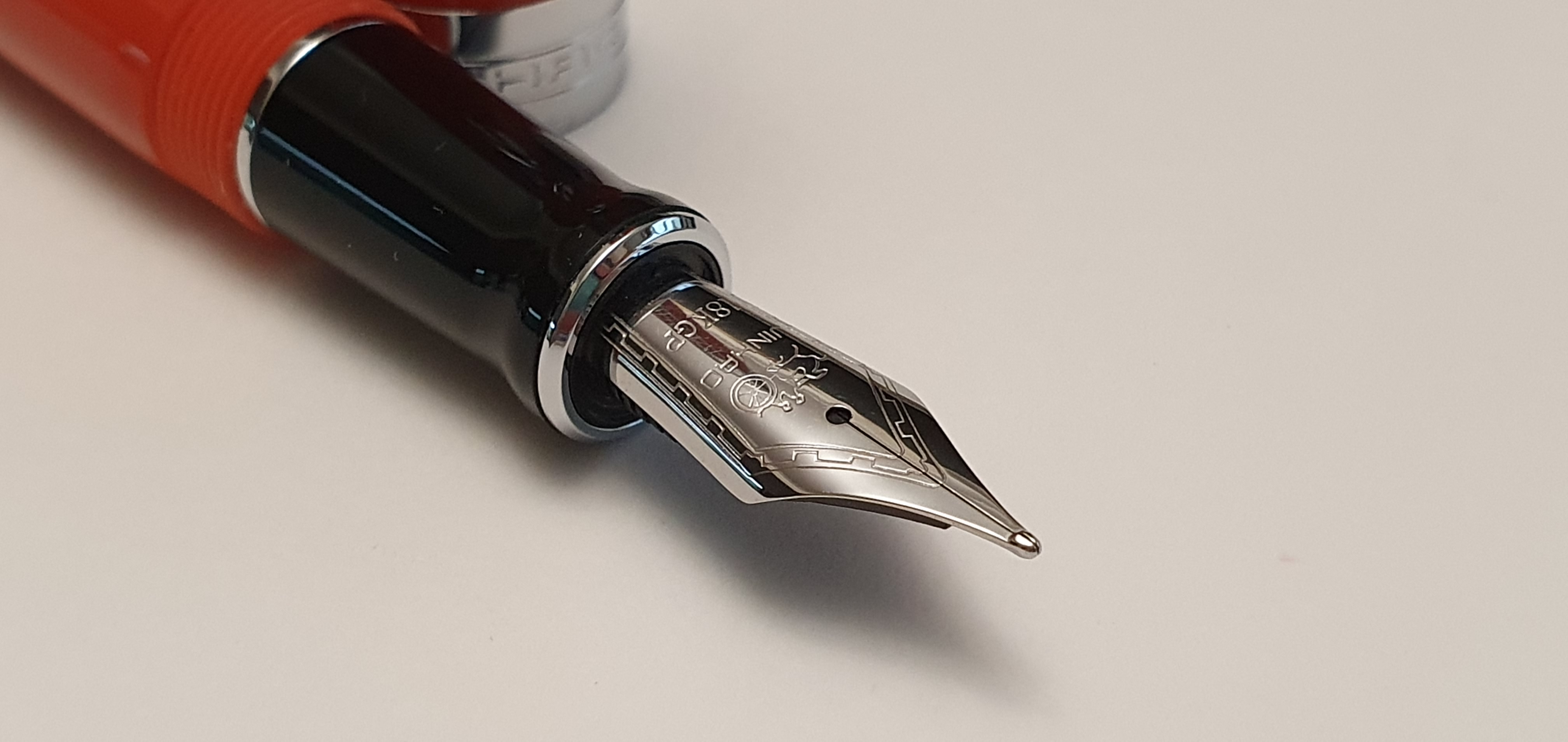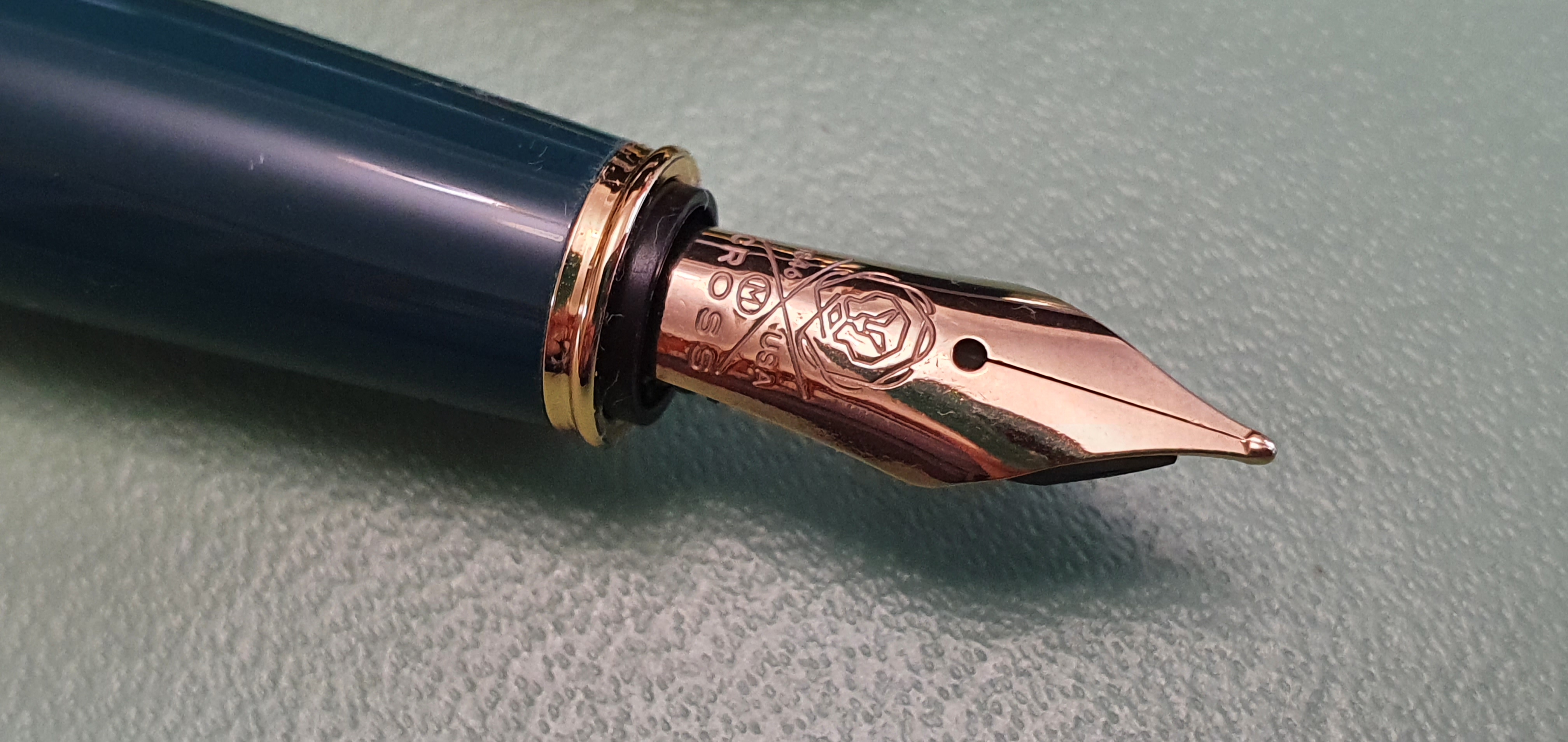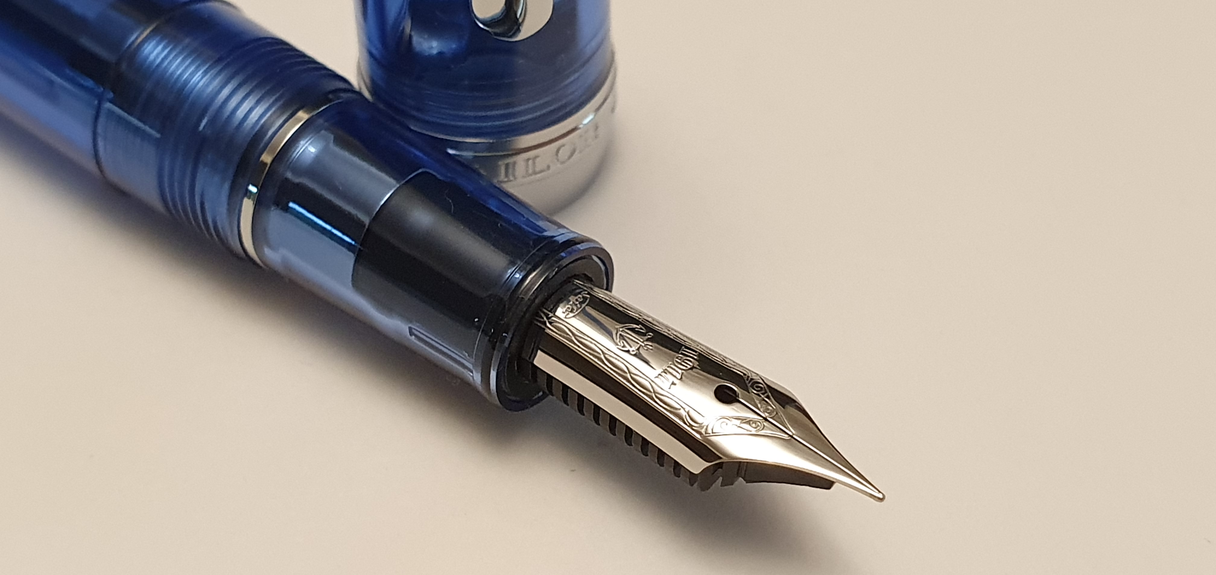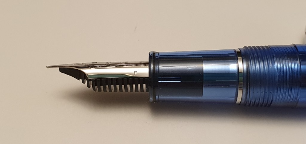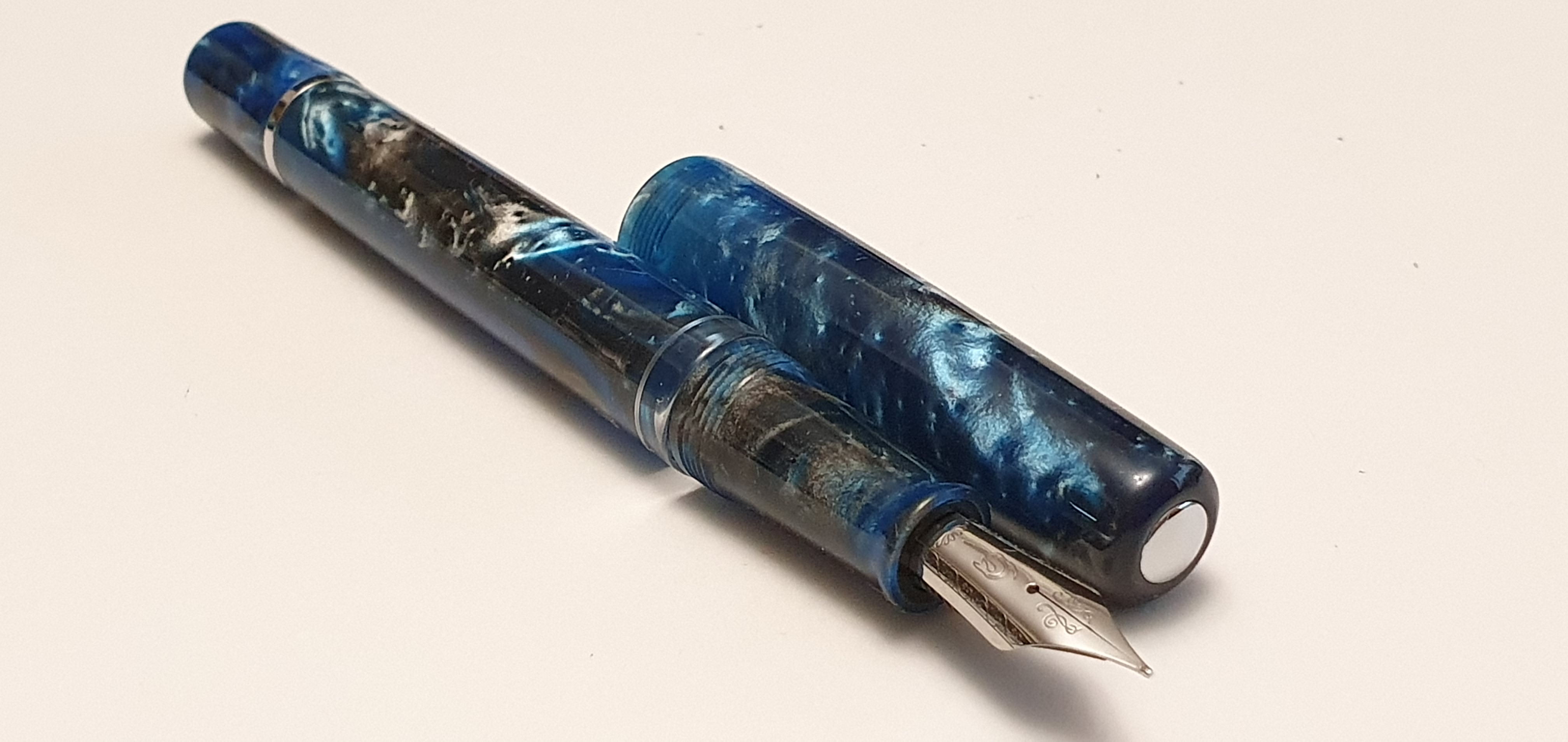 I was thrilled to find that on rotating the pen, the patterns revealed what with a little imagination, could be a leaping bright blue Marlin in the resin! Given that this is large size, piston filling pen at £55.00 you get a lot of pen for your money.