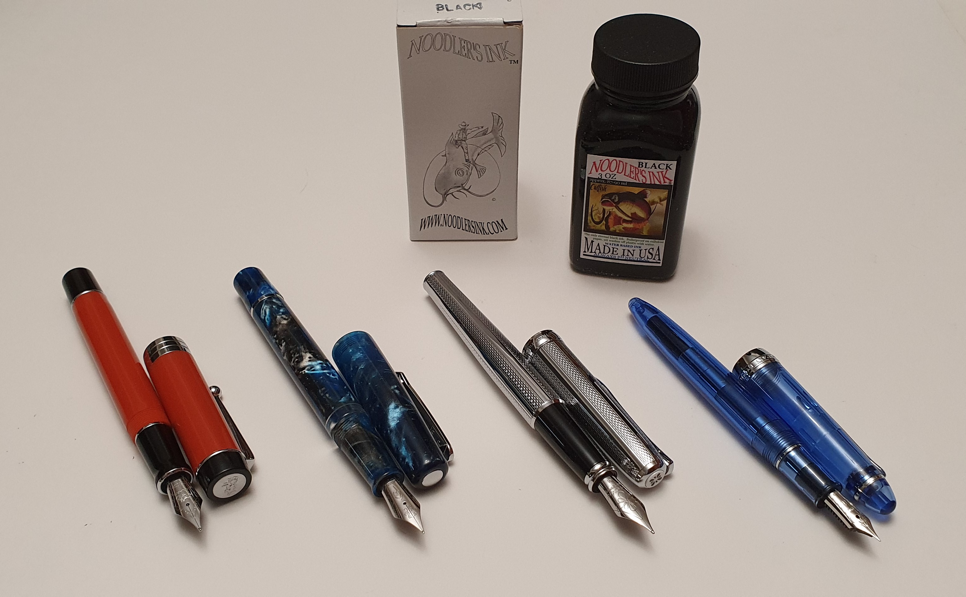 I do not want to ink up all four new pens in one day. That would seem like opening all one’s Christmas presents at once. I have flushed them all with water and had a good look at their nibs with a loupe. All look promising and I have no concerns. I am very happy with my purchases, even though my resolve was not as bullet proof as my Noodlers ink.