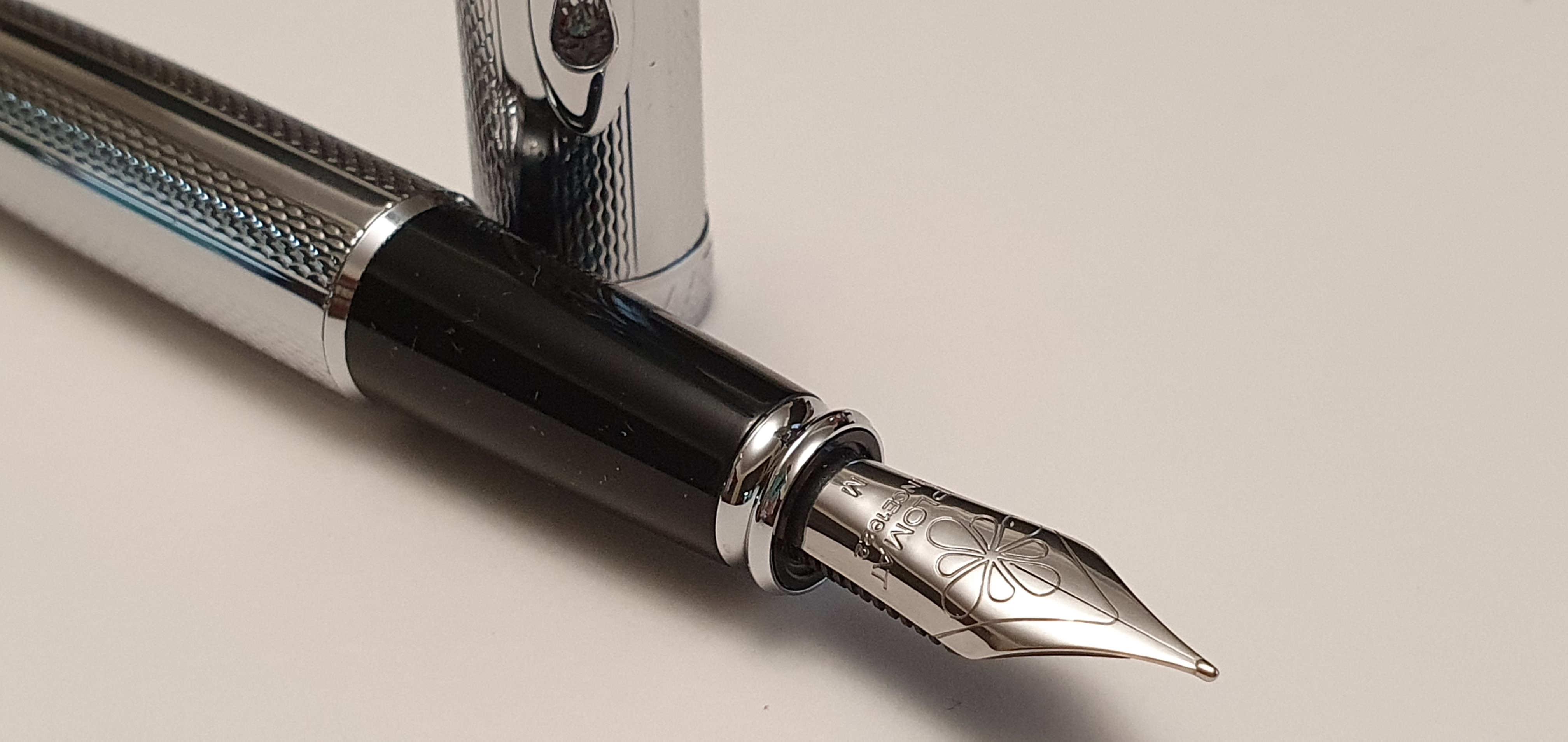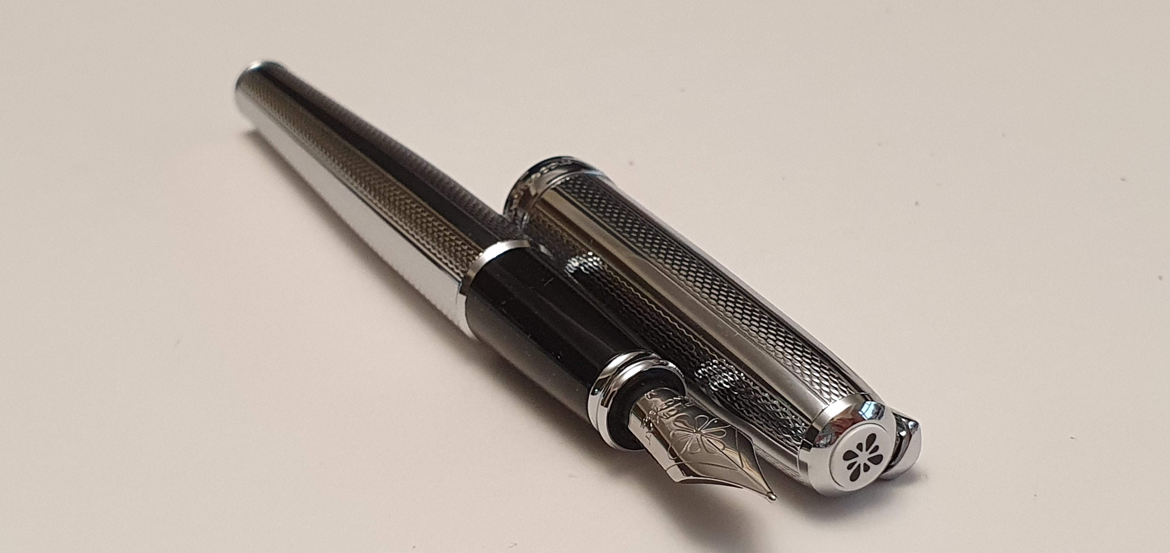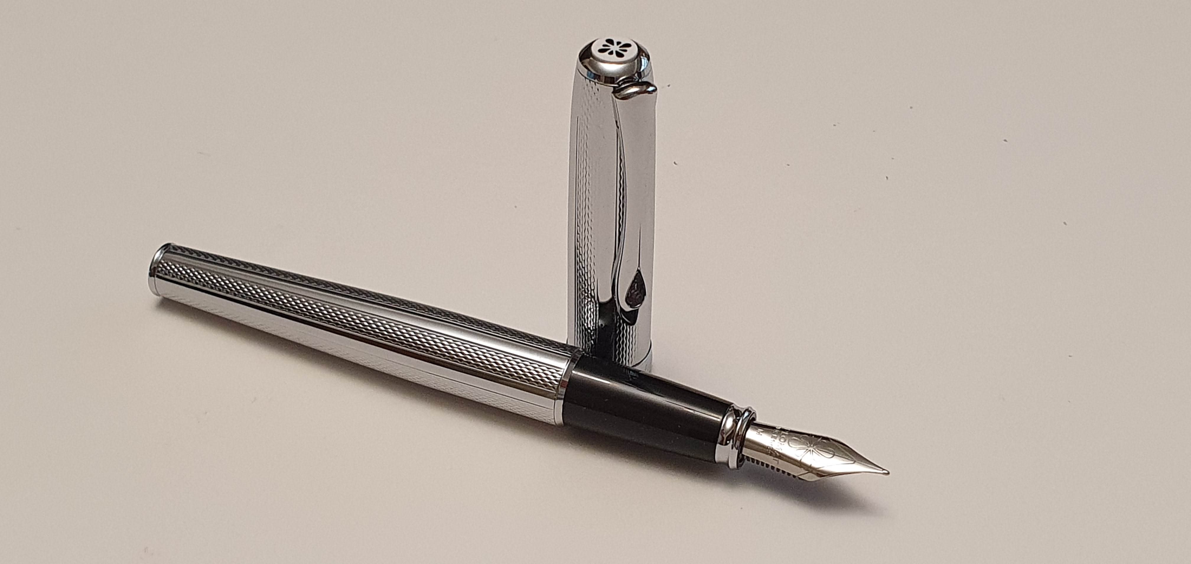 The Diplomat Excellence is one of my all time favourite pens. I have a Marrakesh and a rather less common blue and black harlequin edition and now today picked up a handsome shiny chromium plated guilloche patterned model. As my previous Excellences are both fine nibs, this medium will be a useful addition and was on sale from John Twiss with a matching ball pen for a very favourable price.