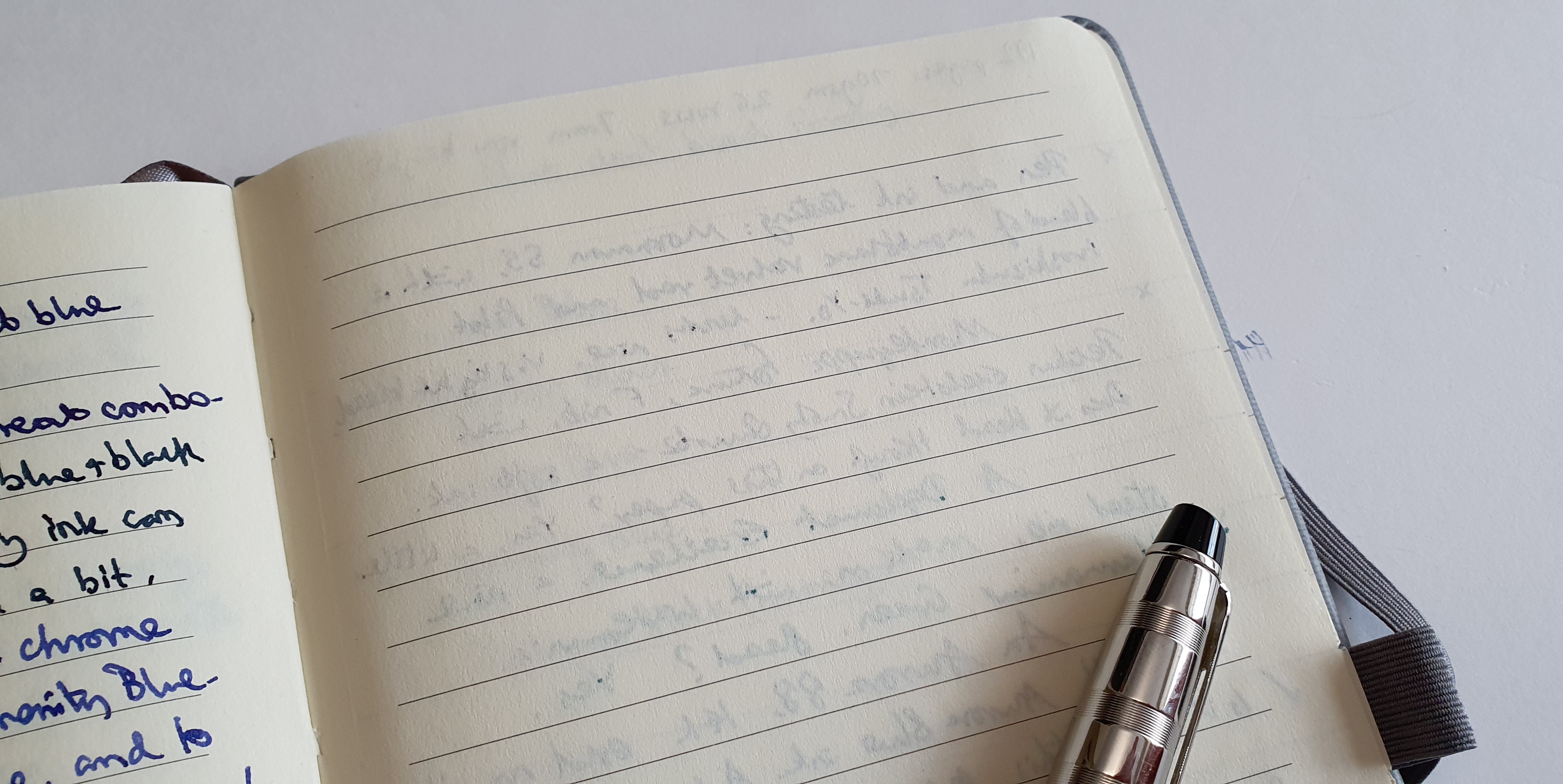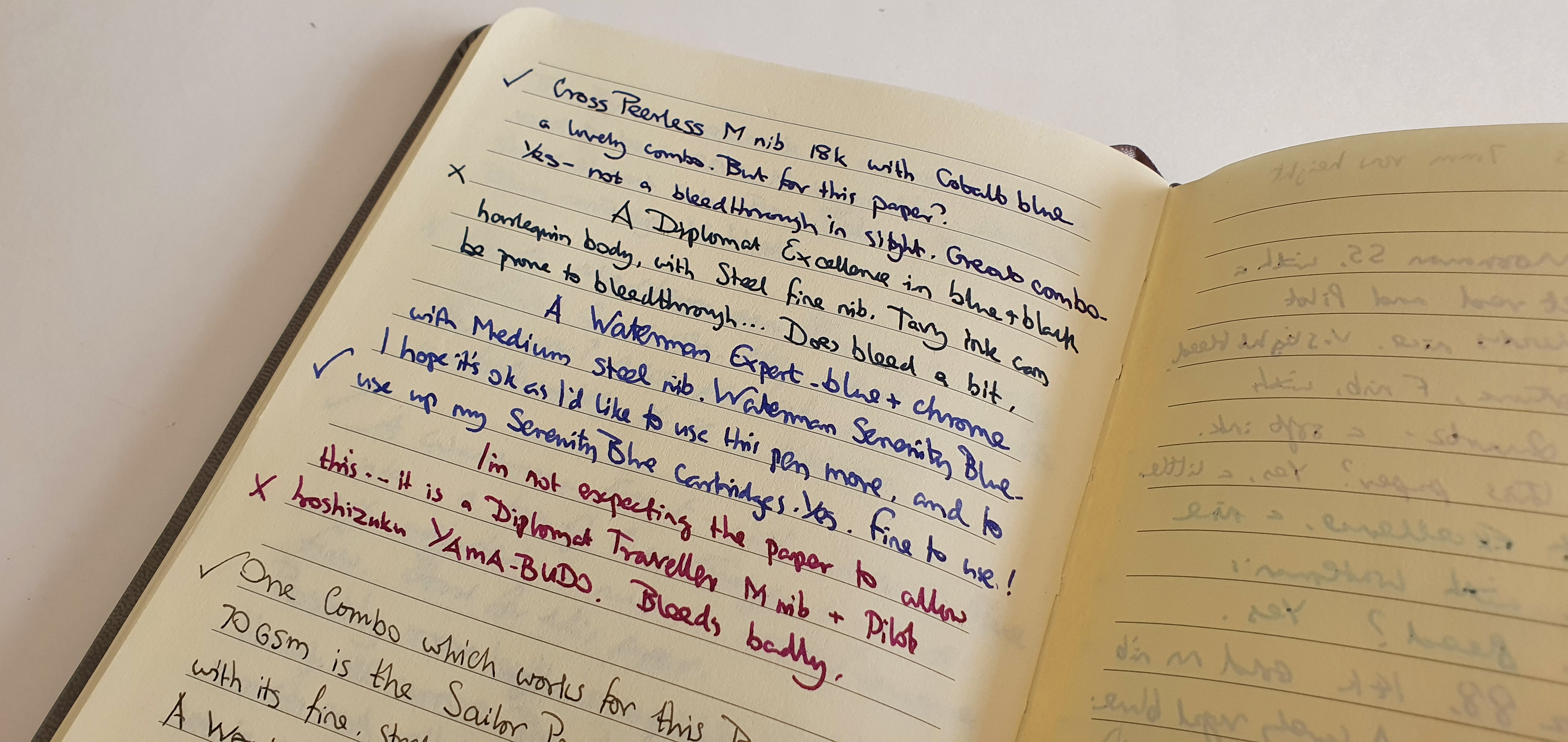 The cream paper, with grey lines, is pleasant enough to write on with a fountain pen. The weight of 70gsm means it is a little on the thin side, and so you can expect some show-through. However it is bleed-through that renders a paper unsuitable for double-sided writing with a fountain pen. I tested a selection of pens and inks from my currently inked pen cups, to see which could be used and which could not.