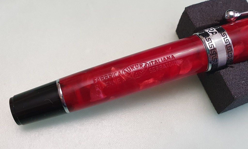 Aurora 88. This is most probably my favourite pen, one of a very small number on which I have ever splurged more than £300.00, (and this was heavily discounted in a summer sale) but has everything you could wish for: black resin barrel and section, gold plated guilloche cap, 14k gold nib, (easily removable), ebonite feed, piston filler and a large clear ink window. It is very comfortable and very handsome. Filled with Aurora Blue.