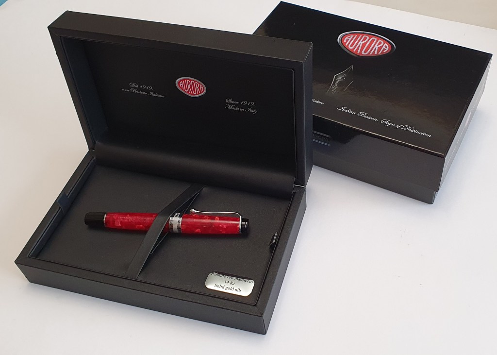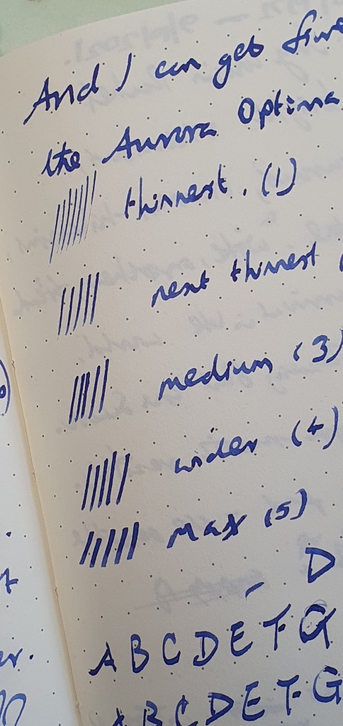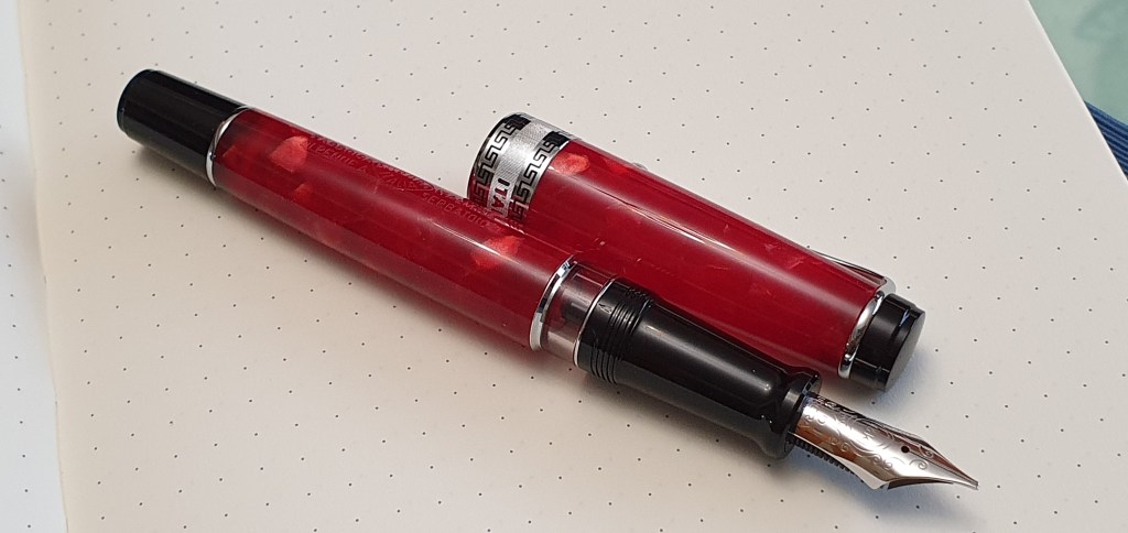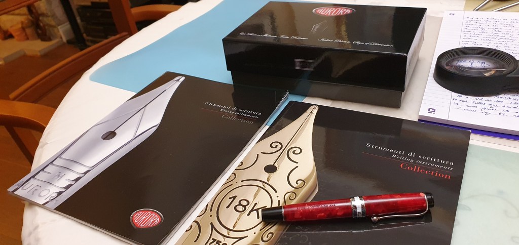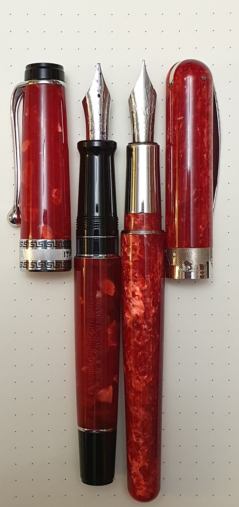 Aurora Optima rossa, OB nib. This is my latest significant purchase – in which I was hoping to combine the joy of my Aurora 88 with the joy of my Moonman S5 oblique broad nib! It is a lovely pen and I am very happy with it but to be honest its OB nib does not perform any better than the Moonman’s. It probably needs to wear in a bit more. But the materials are beautiful to look at and to feel.