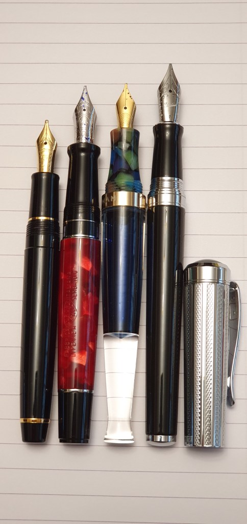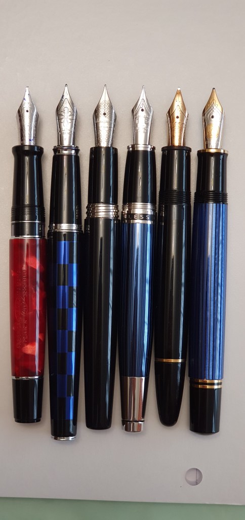 At home it is a different story as I am constantly picking up a pen and writing a paragraph or two just for relaxation and the sheer joy of the flow of ink on the paper, hence the variety. So here they are, roughly from left to right:-