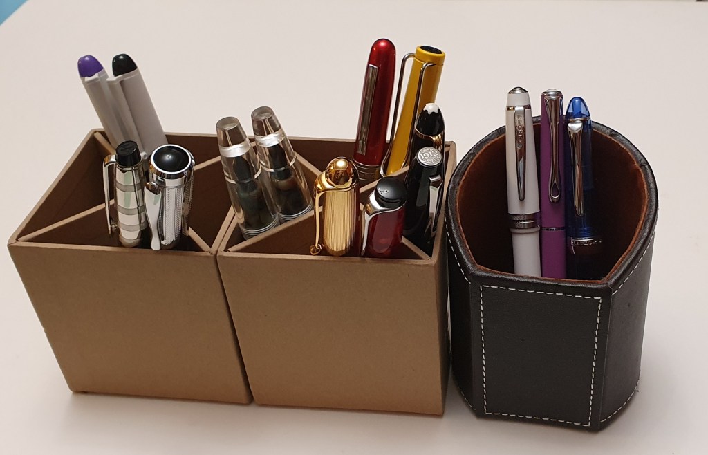 I should point out that the fifteen inked pens at home is not quite the end of the story and that I counted a further four fountain pens in my pen cup at work. These are a Parker Duofold, a Cross Bailey Light, a Moonman S5 with oblique broad nib and a Pilot V pen with red ink. The first three are filled with blue black, black and blue ink, respectively. These meet all my needs at work – for writing notes, signing letters and documents or amending drafts.