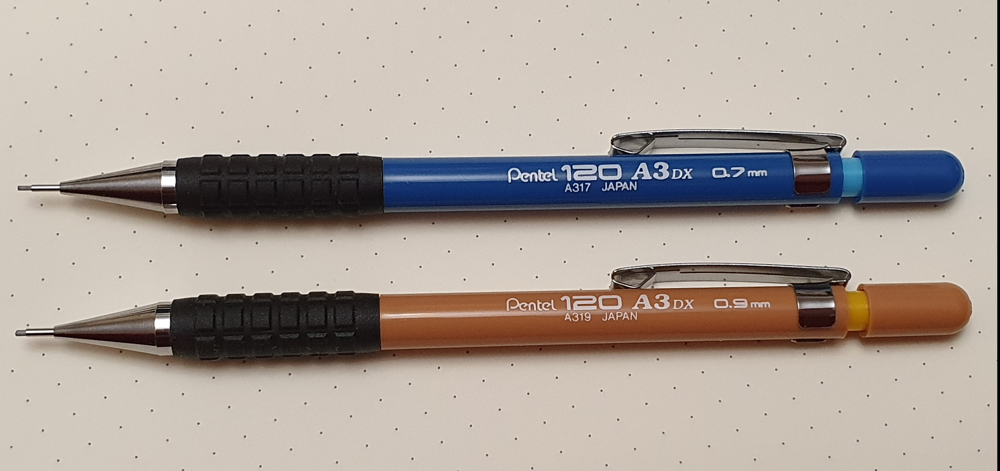 In a stationery shop not far from home, I came across some Pentel mechanical pencils recently that I had not seen before. I am a big fan of the P200 series, using them daily at home and in the office, but had not seen their cheaper “120 A3” series. Available in the same four lead sizes, 0.3, 0.5, 0.7 and 0.9mm as the P200, you still get a sturdy metal nose cone, but with a comfortable grippy rubber section. I bought a couple of them and have been enjoying them a lot.