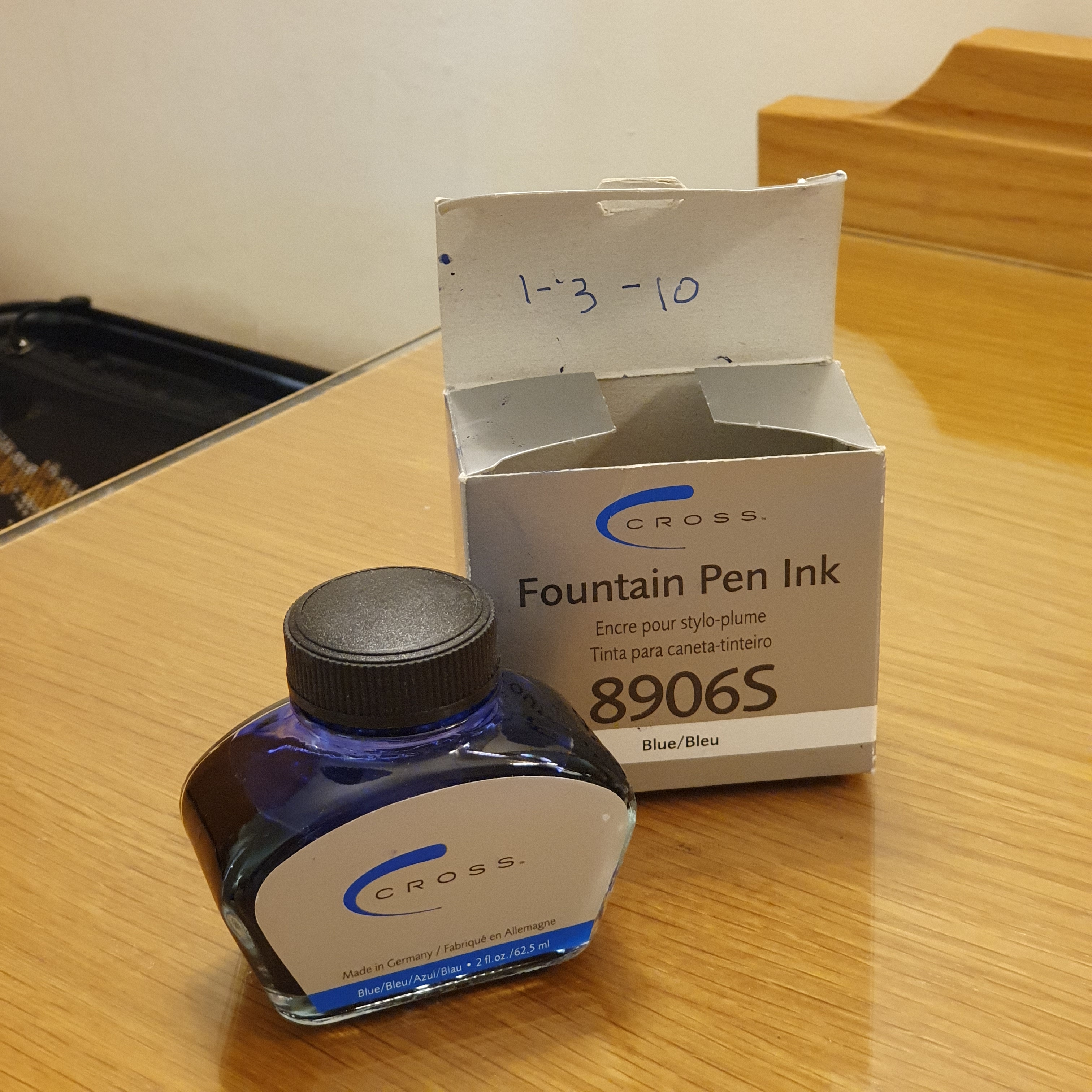 I have written before about my late Godfather, uncle Brian, whose old Montblanc Mary once showed me on a previous visit. This time, she gave me Brian’s last bottle of Cross royal blue ink to use up, with the date 1-3-10 written inside the box lid. Mary hates waste and I shall try to use it wisely.