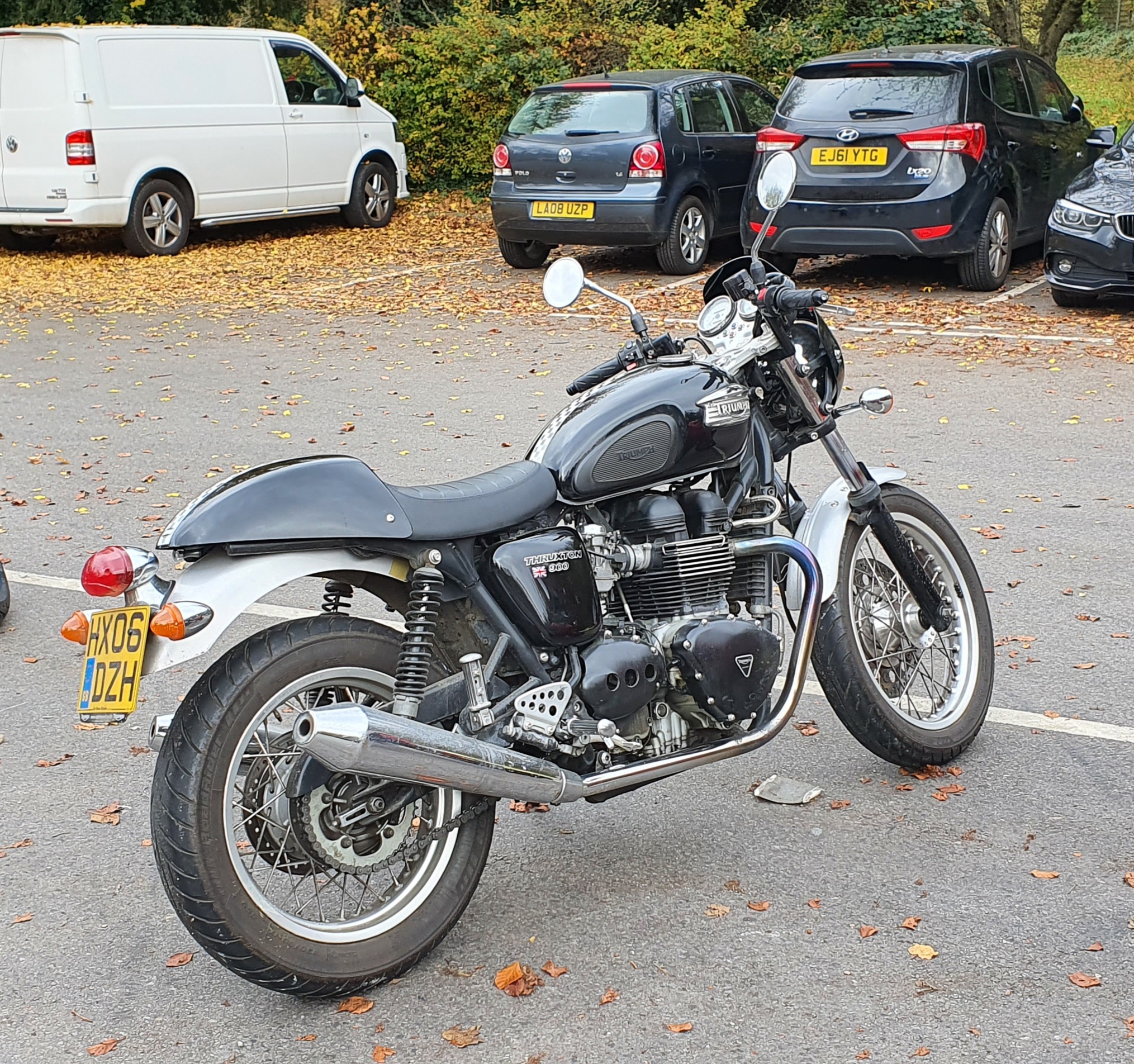 Then, having a Sunday morning free in Surrey, with lovely autumn sunshine, we decided to drive to Box Hill in the Surrey Hills, and walk up to enjoy the view. Box Hill is immortalised in the Richard Thompson song “1952 Vincent Black Lightning” and is a favourite spot for bikers. We found ourselves in the Ryka’s Cafe Car Park, full of motorcyles, while their owners stood or sat around at the picnic tables, chatting in their leathers. I was reminded of happy times spent in the London Fountain Pen Club meets, but guessed that my latest pen and ink combination might not have been of much interest to these leather-clad gents (and a few ladies). Each to his own. I wrote in my notebook “We do not choose our addictions.” I am not a biker, to say the least, but if I was, then a Triumph Thruxton that I spotted in the car park stood out from the crowd.