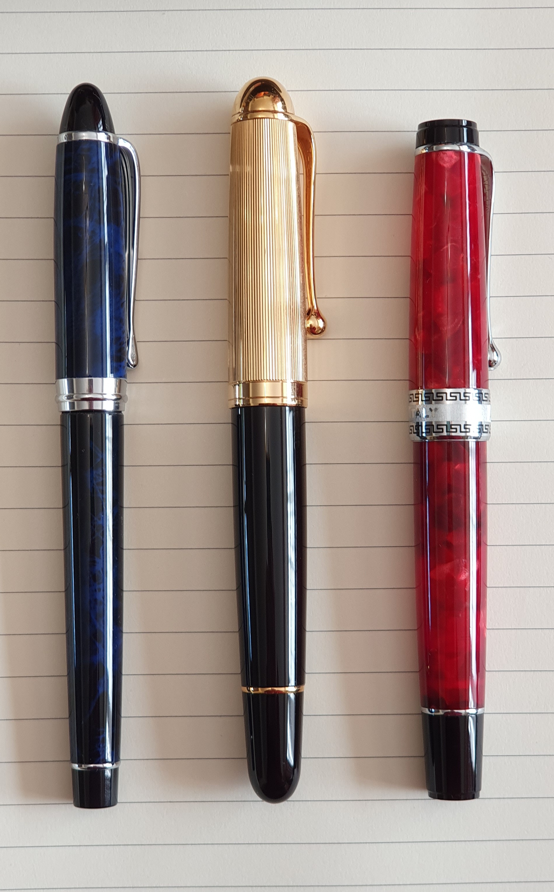 This brings me to the Cleo Skribent Classic Gold fountain pen. I posted a couple of reviews of my Cleo Skribent fountain pens when I bought them, in 2017 which are listed in my Index of Pen Posts or can be seen from here: Cleo Skribent Classic Gold, Piston fountain pen; first impressions and Cleo Skribent Classic Metal, Piston fountain pen review (about the steel nib version). In the following years, I continued down a path of trying lots of different pens and bought dozens every year. The Cleo Skribent Classic Gold rather got side-lined. However last autumn I tuned the 14k gold nib a little bit, to increase flow and lubrication. It just took a few minutes to open up the tine gap very slightly.