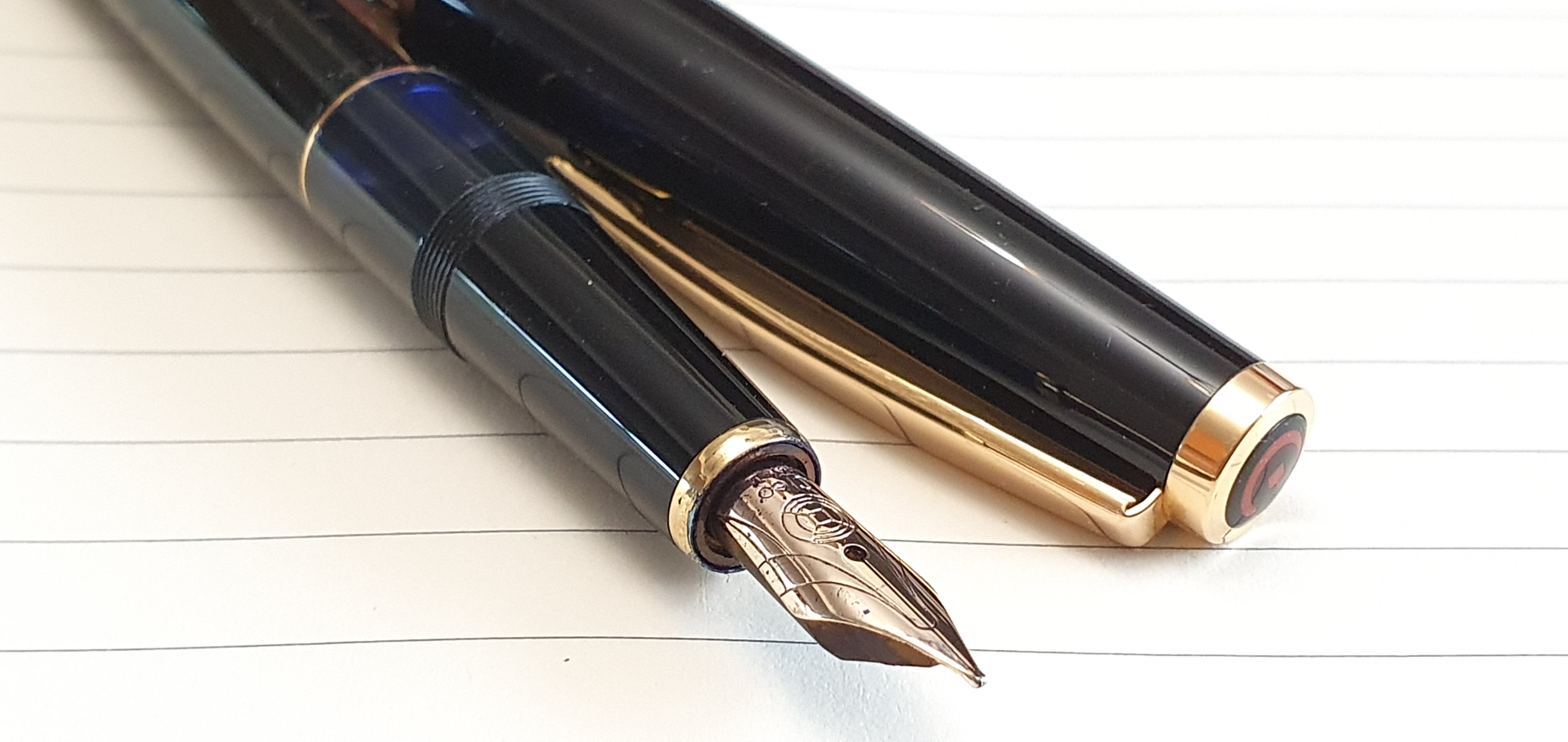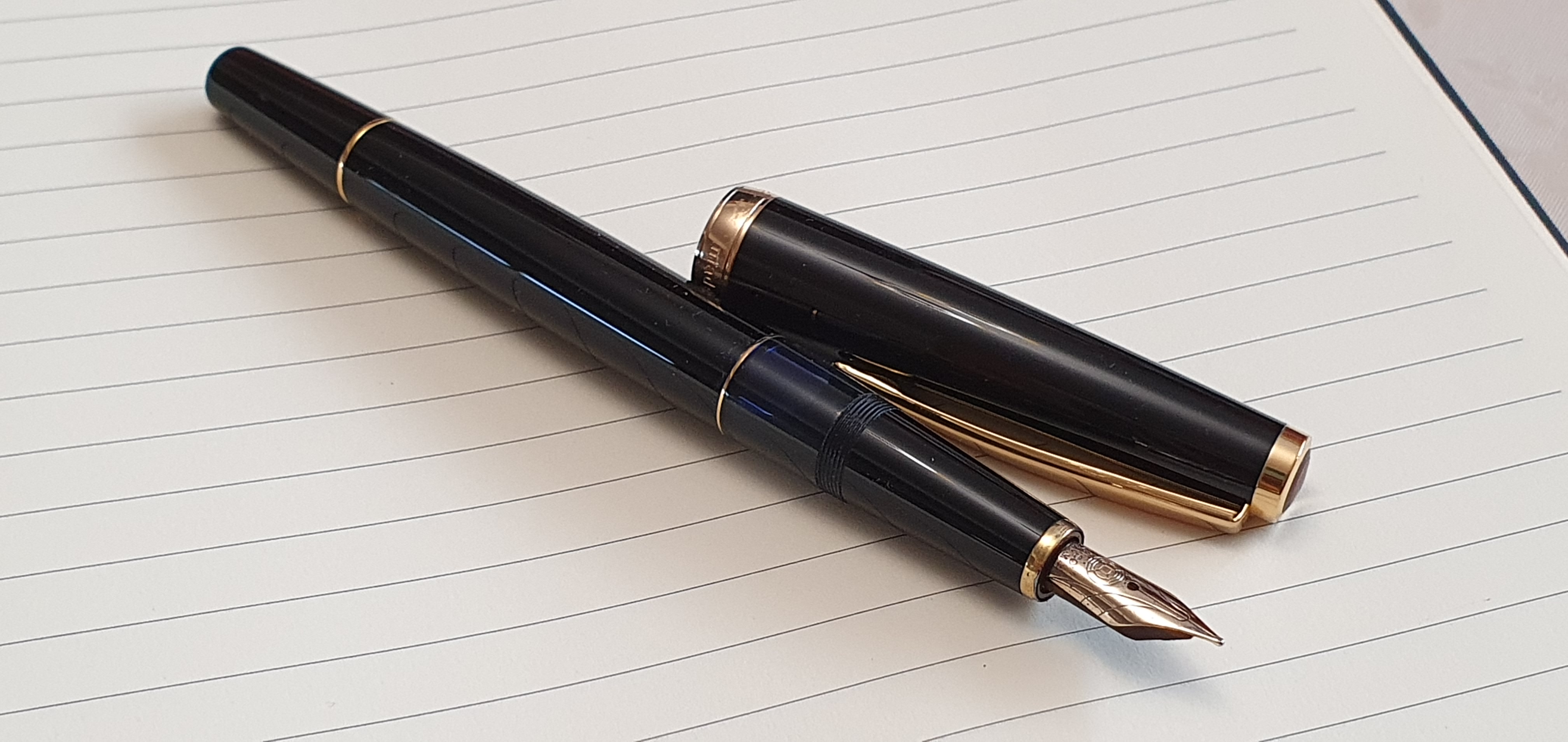 I still love the features that appealed to me then. It is a long, elegant pen, extremely comfortable to hold with a smooth gold nib which has a very pleasing degree of softness on the paper. The glossy black resin of the body looks to me just as “precious” as that found on other more famous, German black fountain pens.