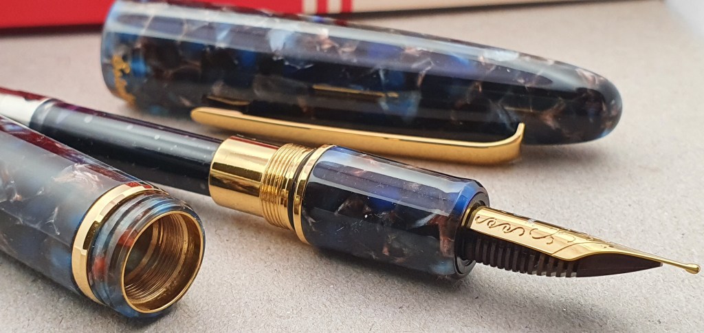 The cap unscrews, needing just over three full rotations, to reveal a section in the same marbled acrylic pattern and that bent nib and metal ring at each end of the section.