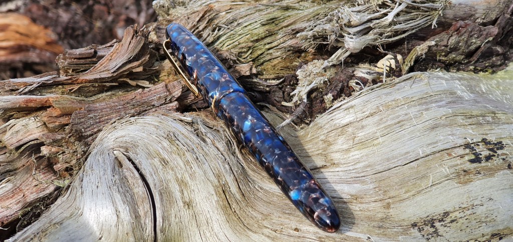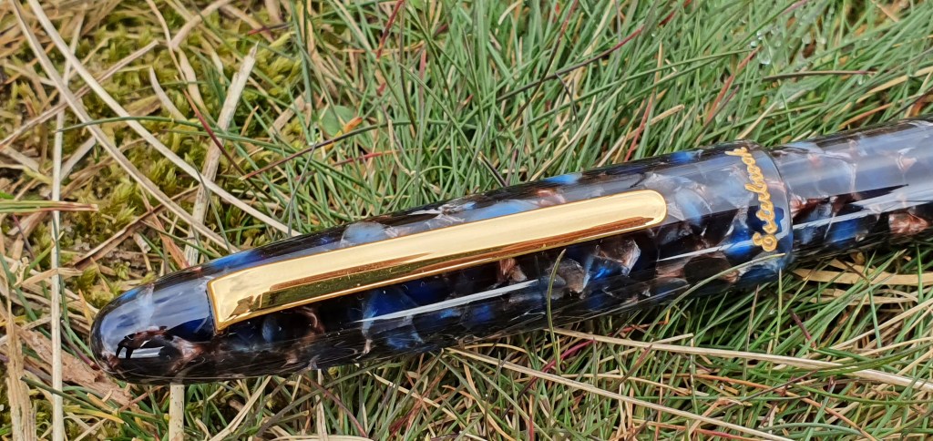 This is an acrylic pen, in a striking green marbled effect with flakes including blue, brown and purple which come to life in good light. There is an acrylic finial, a silver coloured ring for the sturdy, very stiff, metal pocket clip, a cap band which reads DELIKE New Moon and another silver coloured decorative ring near the end of the tapered barrel.