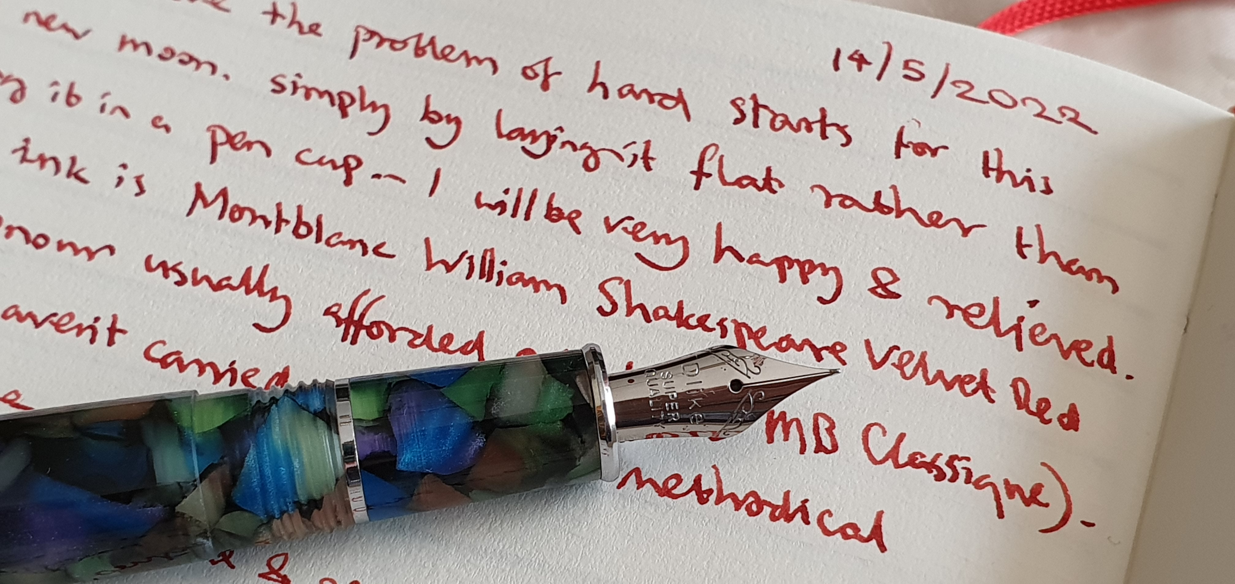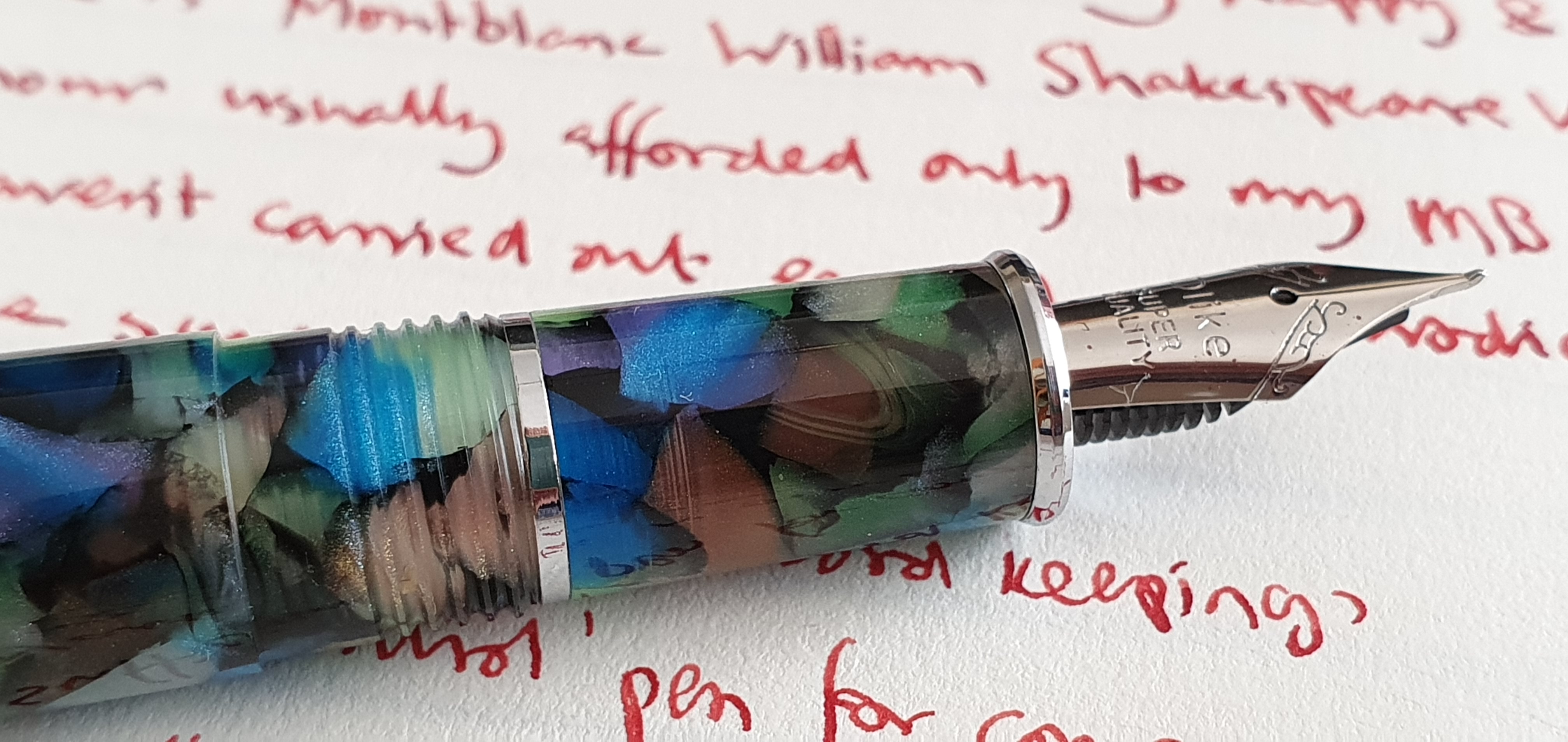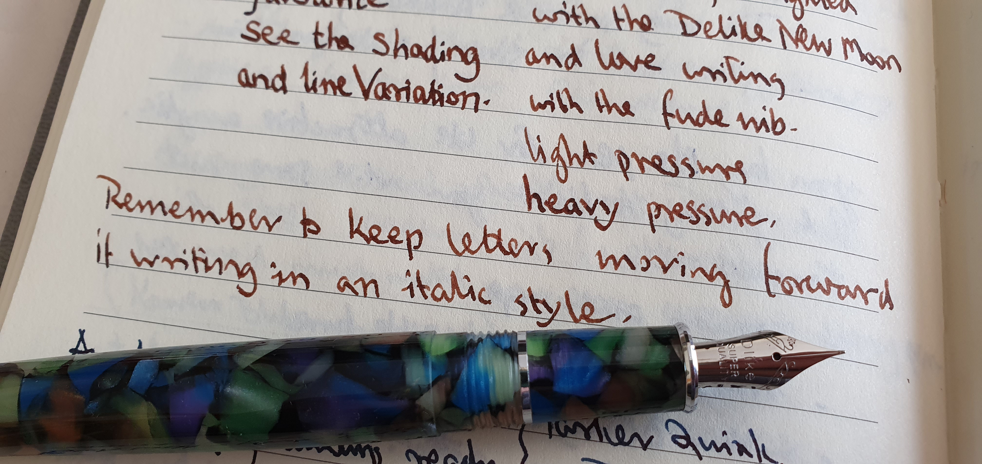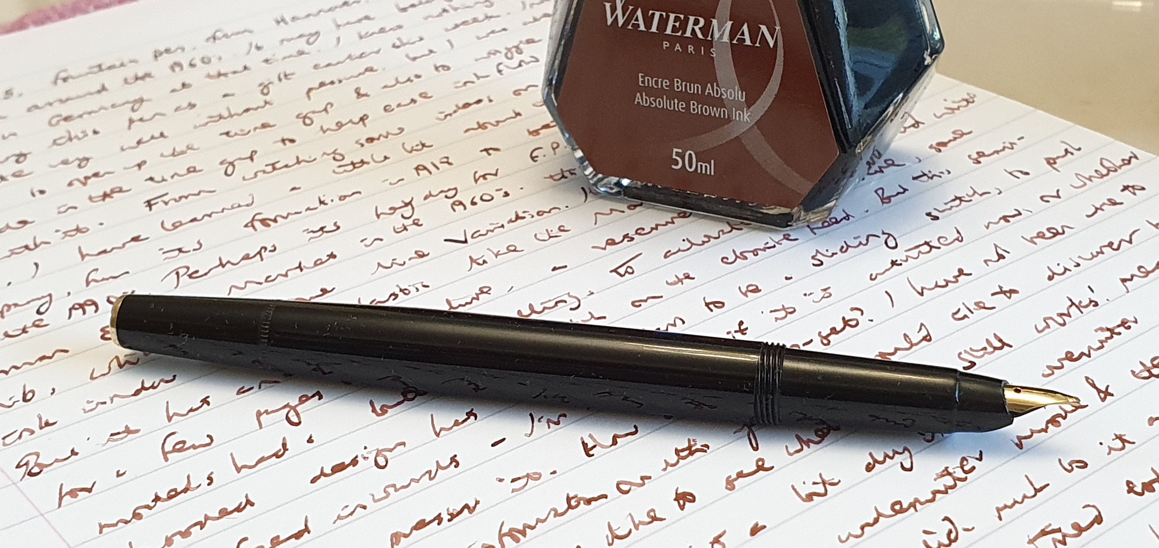 I inked it up with Waterman Absolute Brown ink. Initially the pen wrote rather dry and pale and needed pressure on the nib to keep ink flowing. I decided to try flossing the tines. I then tried widening the tine gap just marginally by bending the tip upwards, before trying again to widen the tine gap by means of inserting the blade of a craft knife in the gap and wriggling it very gently from side to side, until the pen wrote smoothly and with only minimal downward pressure.