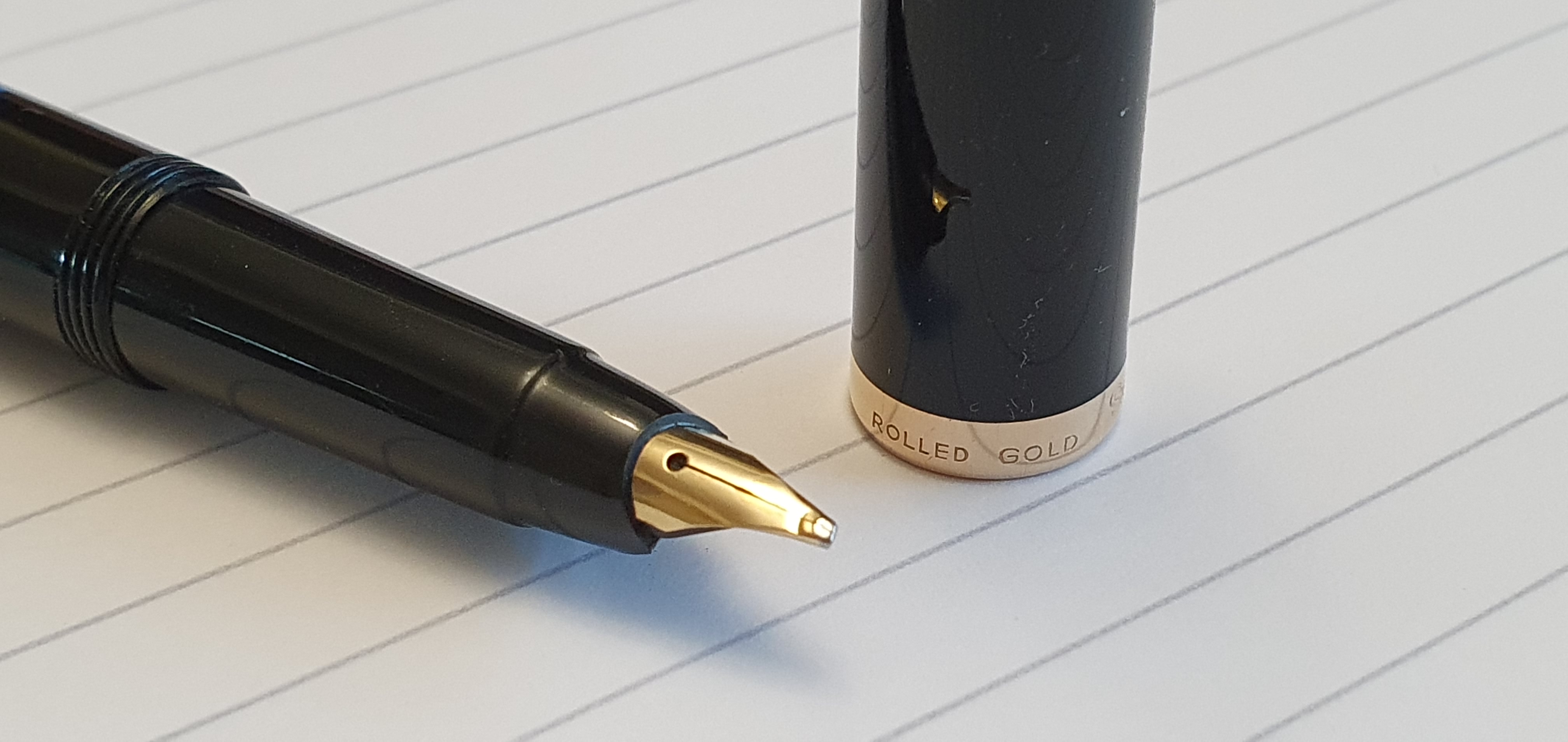 The nib looks like gold, but my friend tells me it is steel. There are no visible markings on the exposed part of the nib. I presume that both nib and cap ring are plated in rolled gold. The nib shows no sign of any rust or staining, although a slight kink just behind the tipping suggests that the pen may have been dropped at some point and the nib straightened out again.