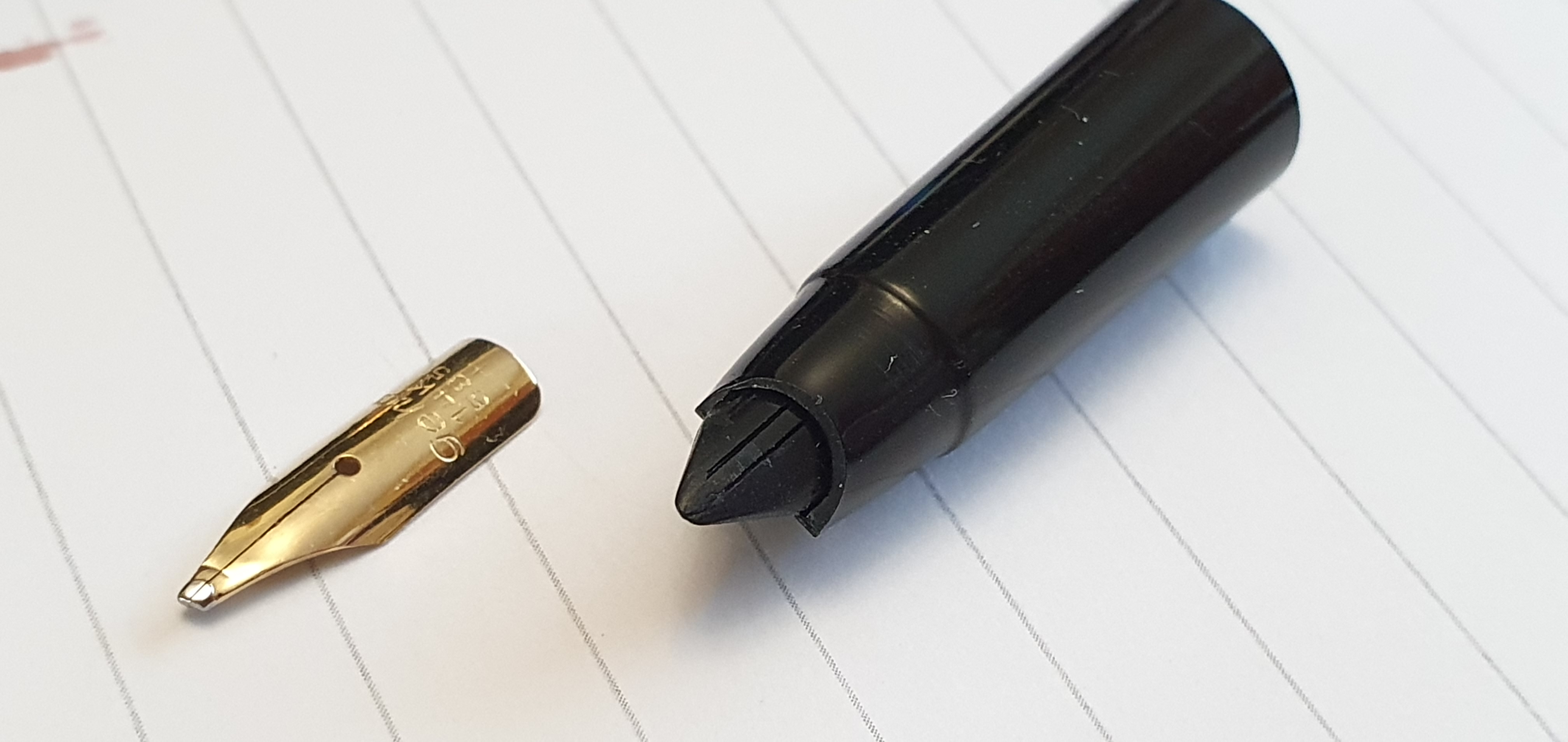 Following a suggestion by Gasquolet in the comments to the above post, I learned that the section unscrews, just before the cap threads. This exposed a rather delicate looking feed, protruding from the section, with a small collar piece at the top. I lifted off the collar, pushed the delicate feed channel out through the front, and was then able to pull the nib out. Sure enough the nib is gold. It is clearly marked Geha 14k 585, but you do not see any markings when the nib is in situ.
