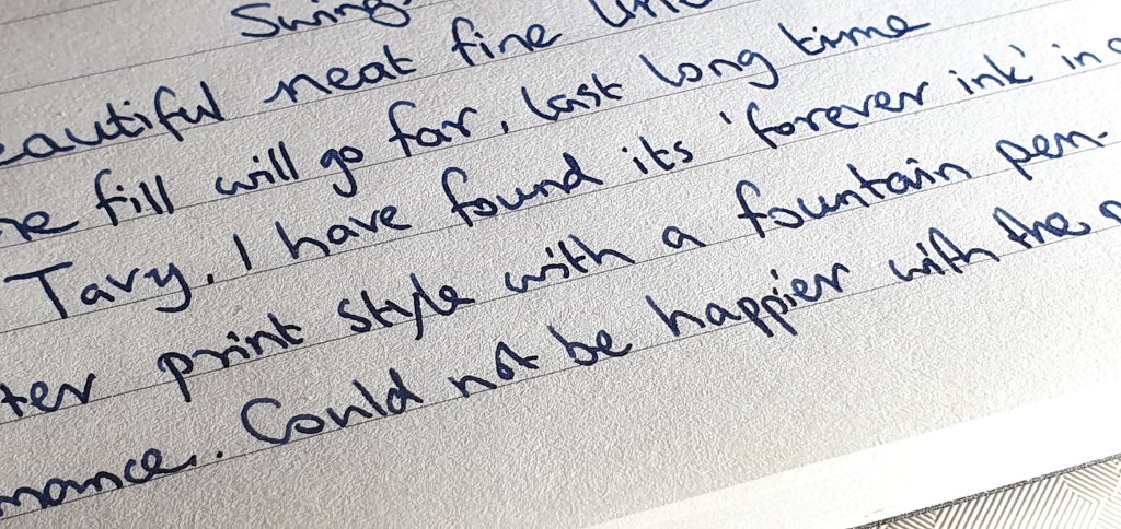 One of the first things to be done of course when trying a new notebook, is to test the paper for fountain pen ink. I usually select a handful of pens from my “currently inked” pots and write a line or two with each, to see how the pen feels on the paper, whether it feathers, and crucially whether it bleeds through the paper or shows through too much. I am happy to report that with all the inks I tried, these tests were a success. There was no bleed-through with any of them and very little show-through either.