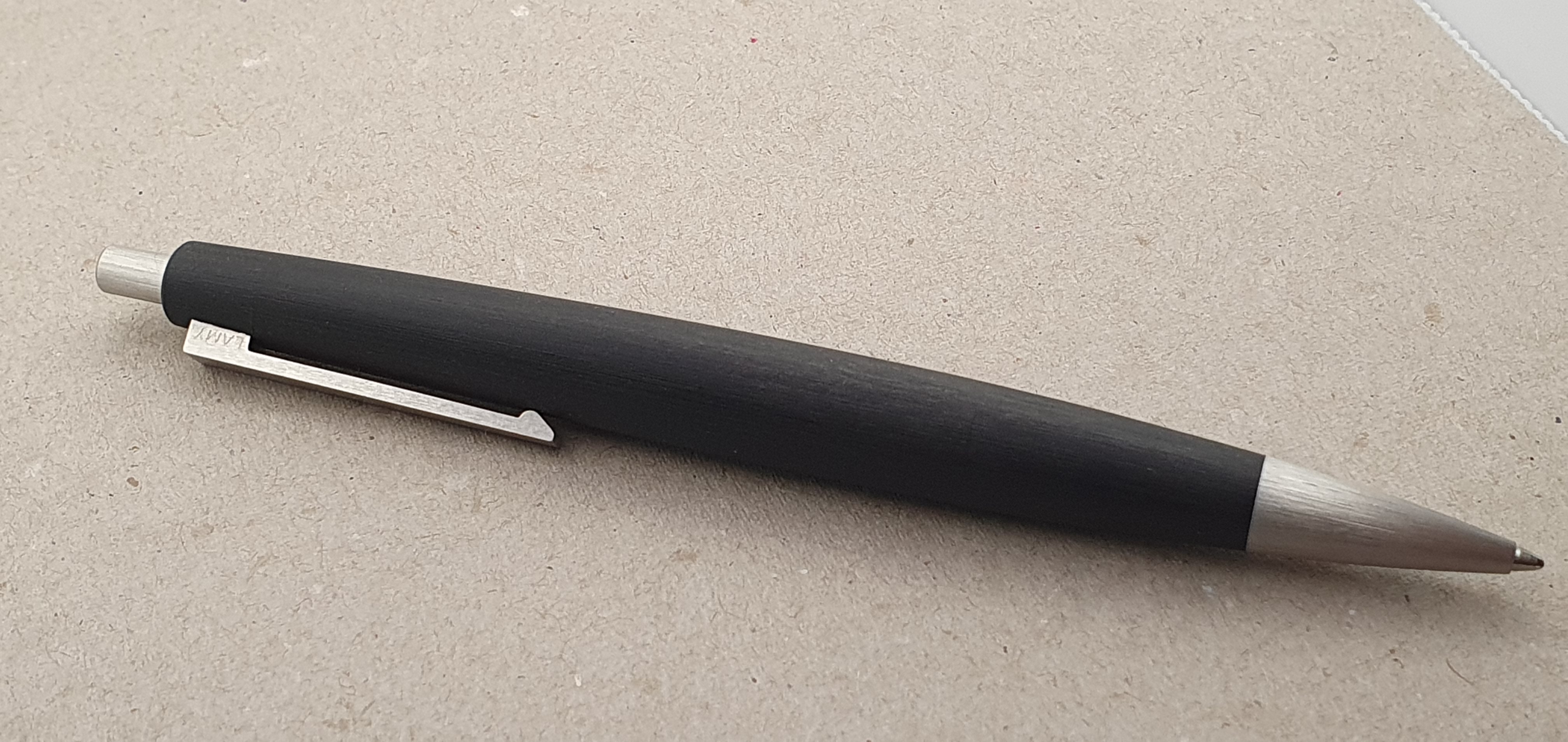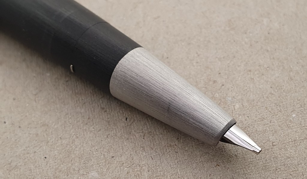 For me, the beauty of the Duo Cart lies in its profile, the gentle tapering of the section towards the hooded nib, the curvature of the hood itself with its striking parabola of resin, partly covering the nib and then, viewed from the side, the curved cutaway and the curved plastic feed. The tapering is matched at the opposite end in a truncated bullet-shape barrel with a shiny metal disc inset at the base. The pen looks and feels good in the hand and looks good on a table.