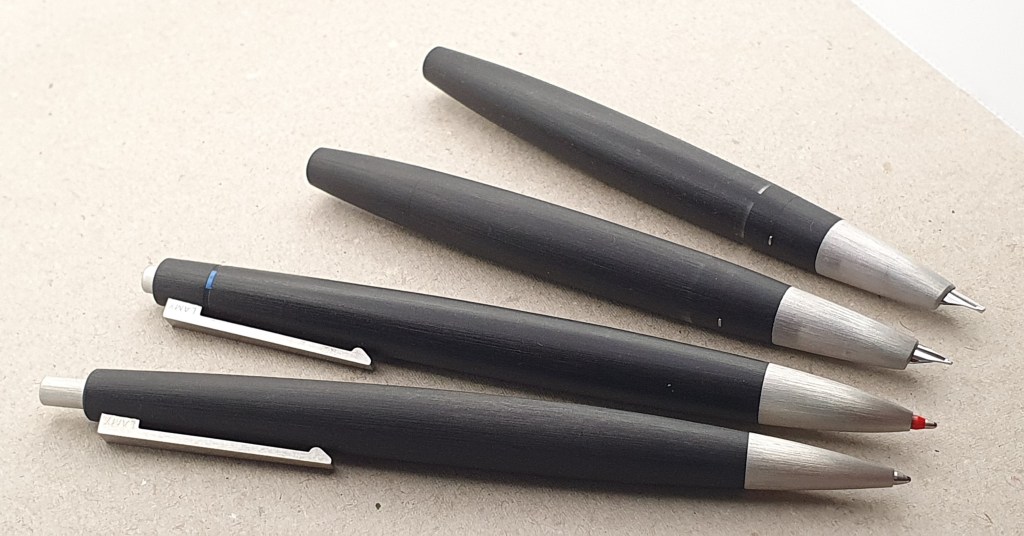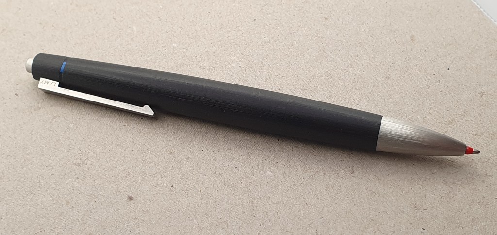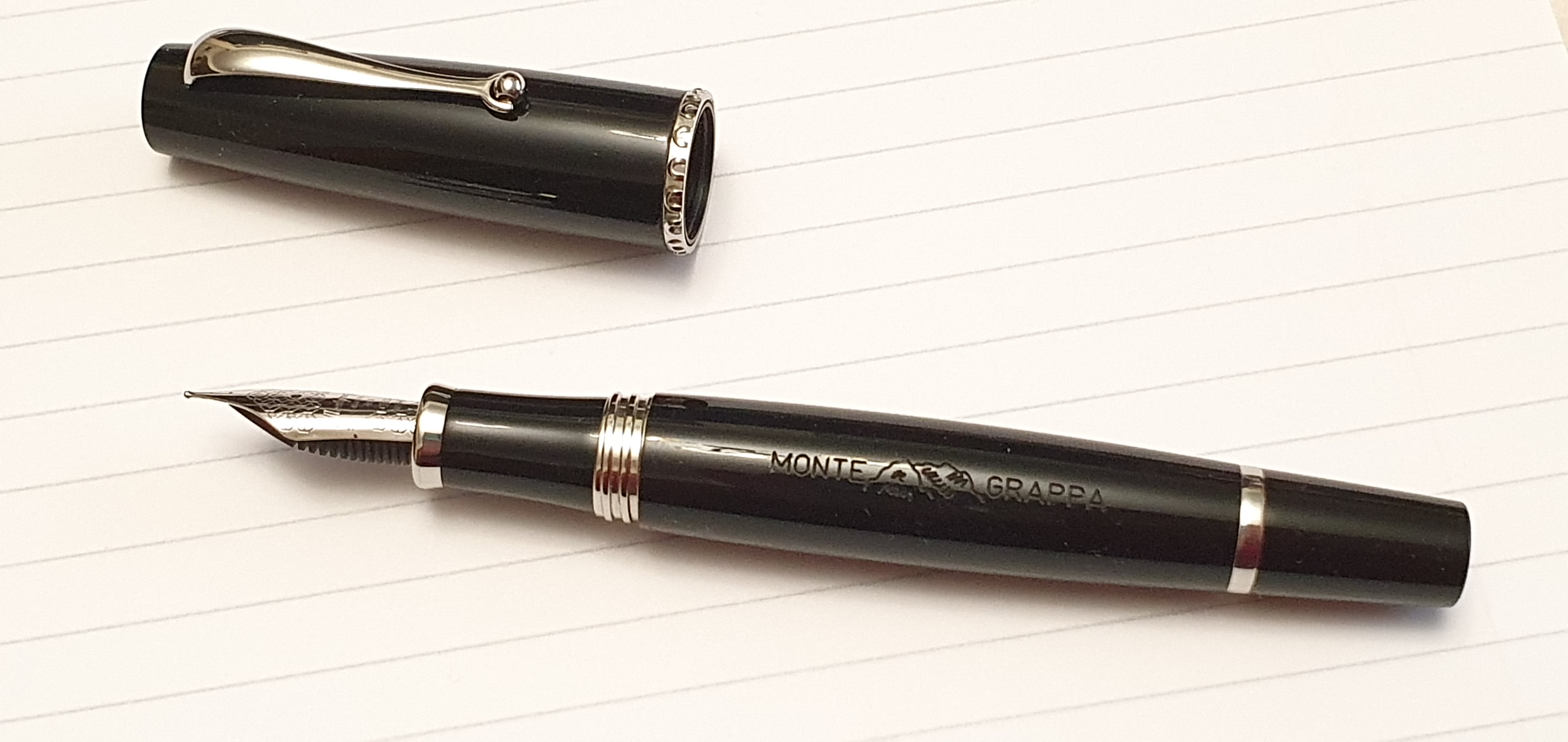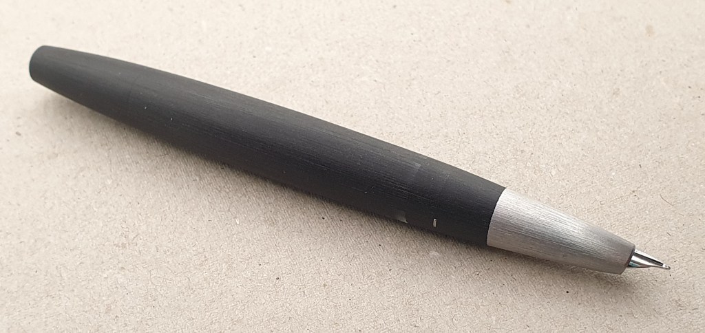 This is a cartridge-converter pen, in black resin with a shiny metal cap and a distinctive hooded steel nib. It was introduced a few years ago and is part of Aurora’s current range but has its origins in the Aurora 88 designed in 1947 by Marcello Nizzoli. I do not have such a pen to compare but have read that it was 145mm long when uncapped, had an 18k gold nib and was a plunger filler with some form of ink window. It was therefore longer than the modern Duo Cart but the subtle contours of the grip section and the hooded nib look very similar.
