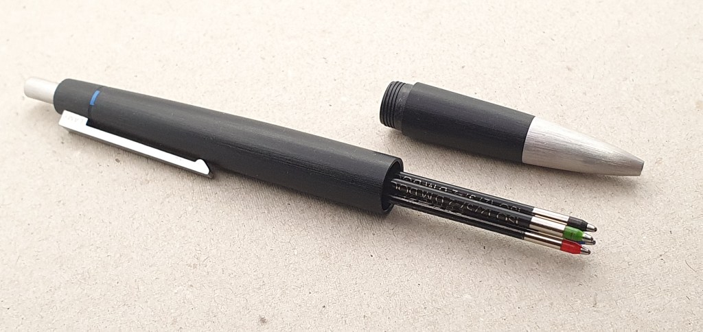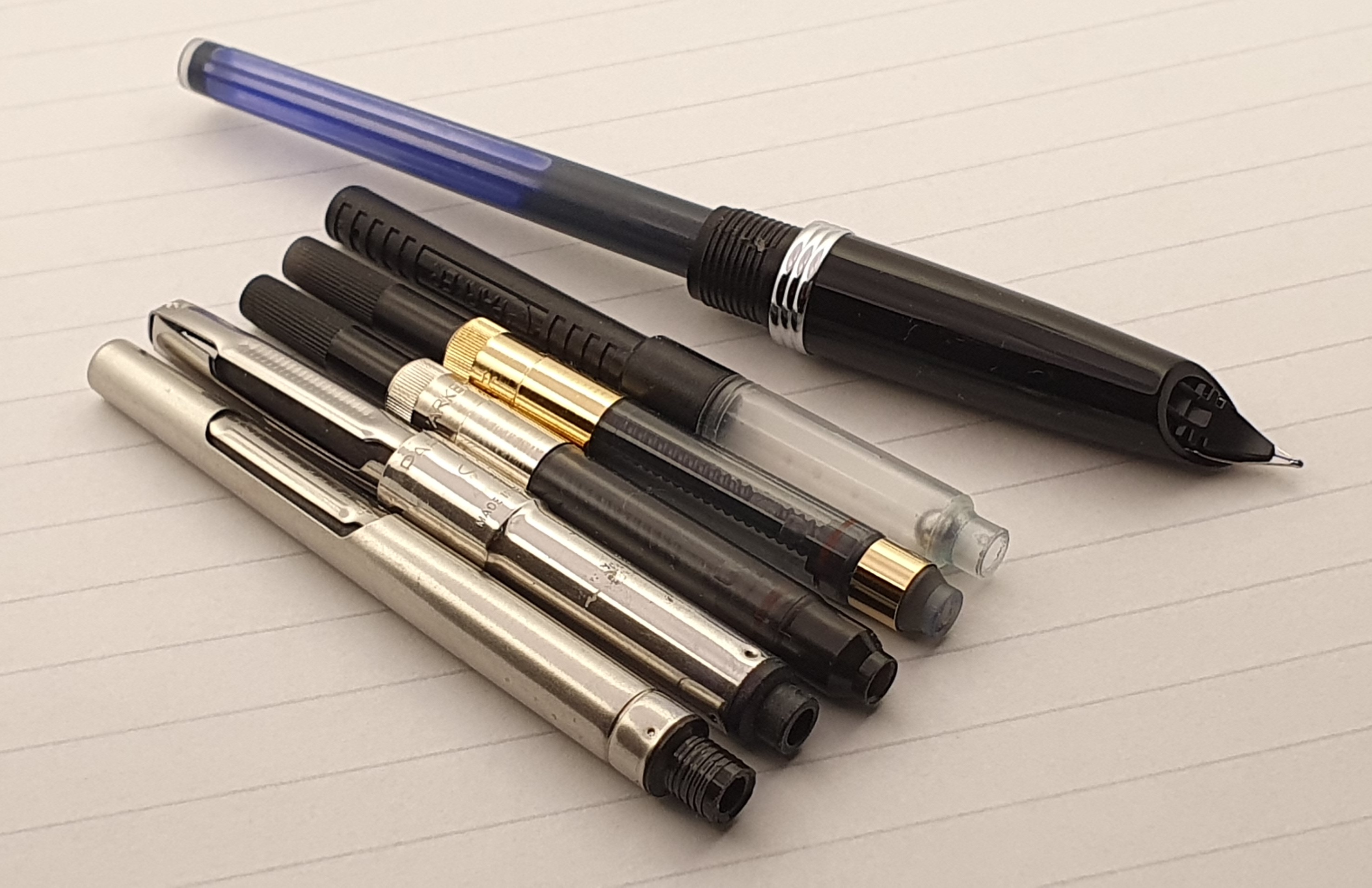 The barrel unscrews on plastic threads. The barrel is of resin but inside the barrel, a brass liner can be seen. The pen takes Aurora’s proprietary cartridges. These can be rather difficult to come by in the UK. My pen, having been a rep’s sample, came without box, papers or any cartridge or converter. I did have some Aurora cartridges at home, which had come with the purchase of an Aurora Talentum, so I inserted one of these. I could syringe-fill these until I find some new ones. However, the good news is that the Aurora cartridge fitting is compatible with Parker Quink cartridges. This means that Parker converters may also be used although this also depends on their girth. I have a selection of Parker converters gathered over the years. One of the squeeze bar models did not fit. Although the coupling was compatible, the barrel would not go over the wide girth of the converter.