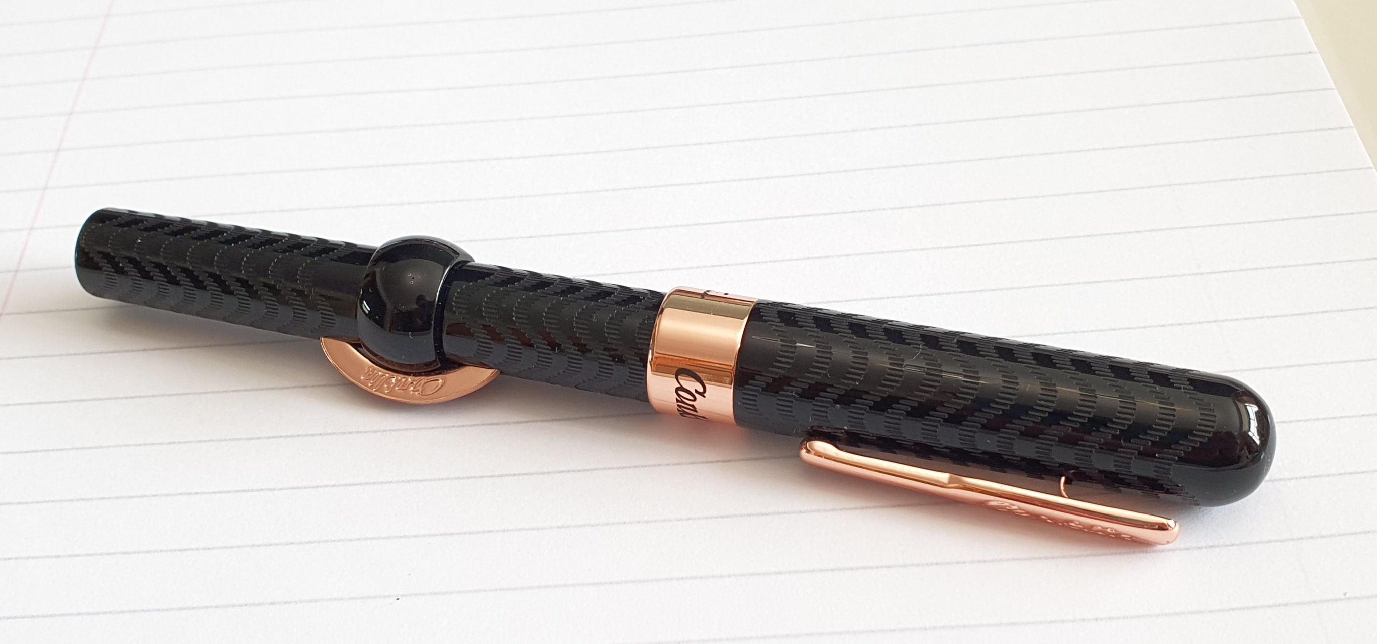 The Duo Cart is a smallish pen, at around 134mm long when capped. Uncapped it is just 119mm long. With cap posted the length is 140mm, but the cap does not feel very secure. I have been cautious of pushing the cap on to the barrel too hard. However I have quickly got into the habit of using the pen unposted. It weighs about 25g, or about 14g uncapped and 11g for the cap alone.