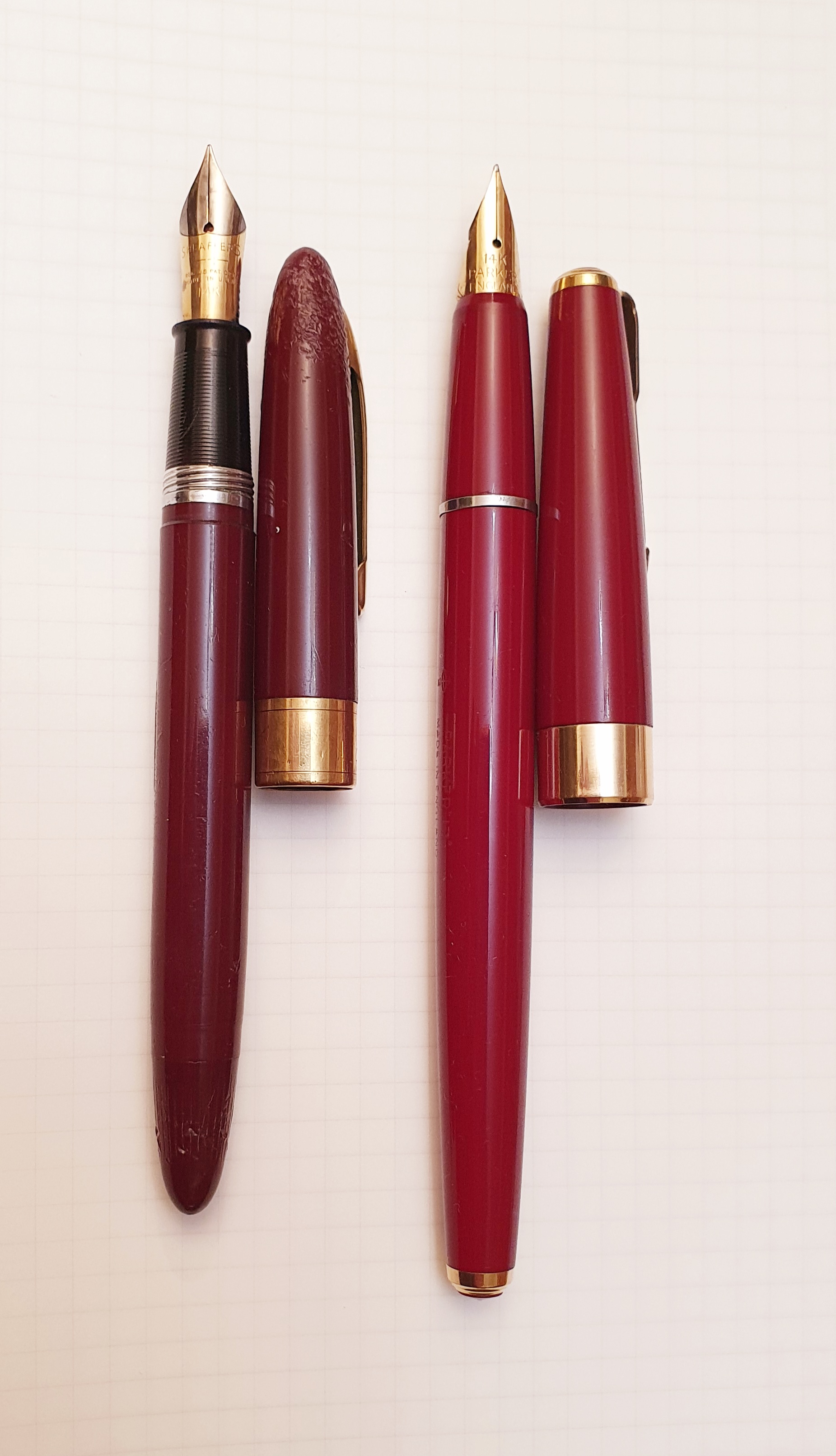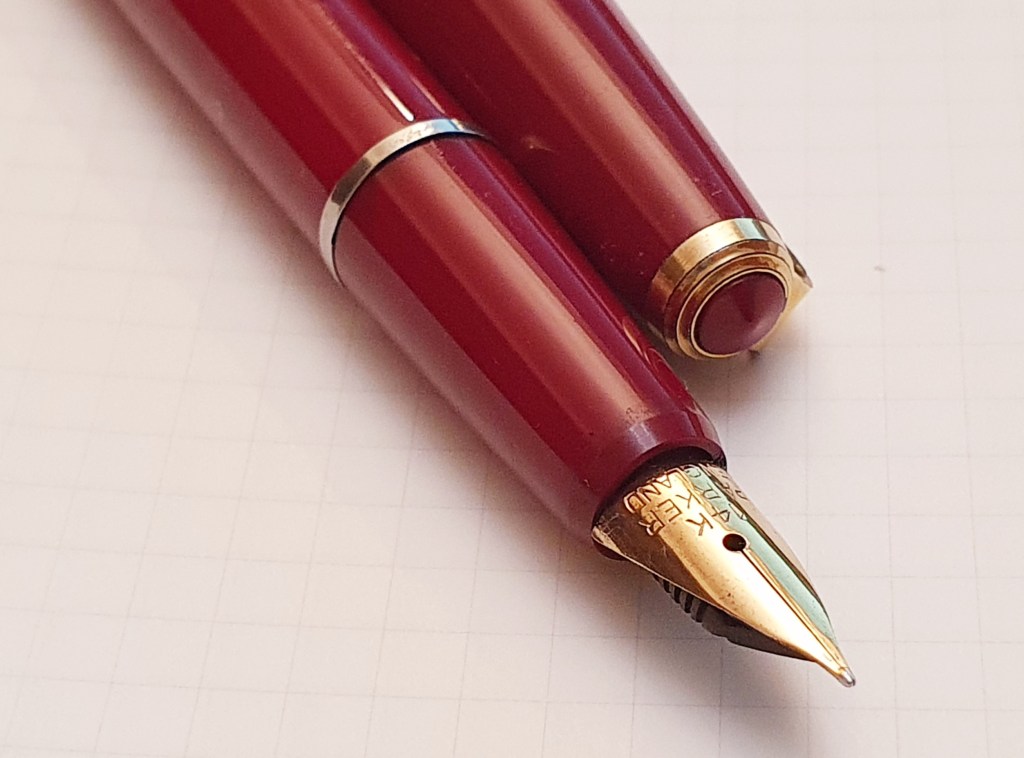 My red Parker 17 Super Duofold is the early model which was made from 1962 to 1964 only. This has an open nib, known as the beak nib, in an unconventional triangular shape. After that year, production switched to hooded nibs for the remaining run of the 17 range, ending in 1972.