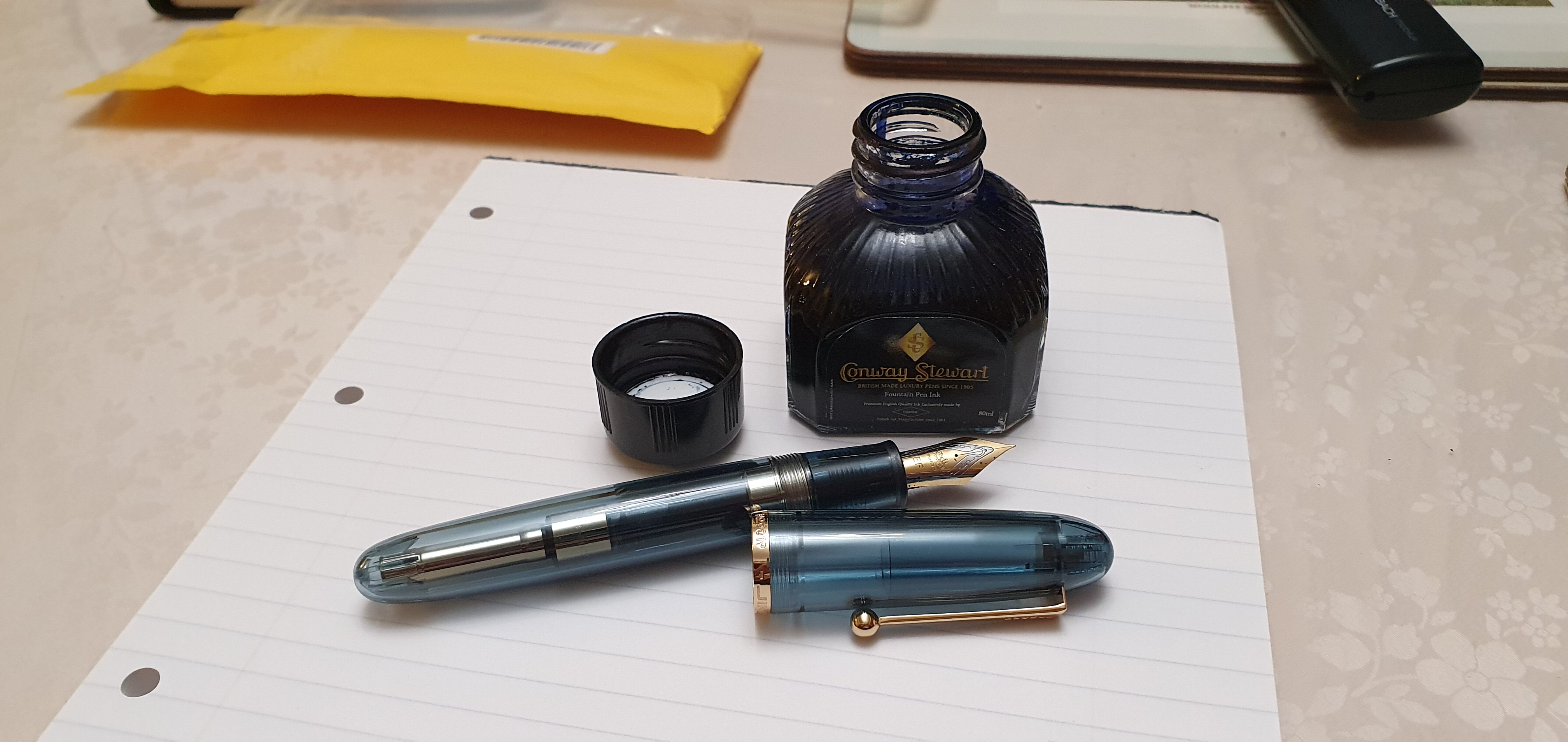 At the end of this exercise, I filled the pen with Waterman Serenity Blue, and tried writing on a Stalogy A5 notebook. Success! The pen writes very nicely. Whilst the generous blob of tipping suggested a Broad nib, the line is closer to a Medium.