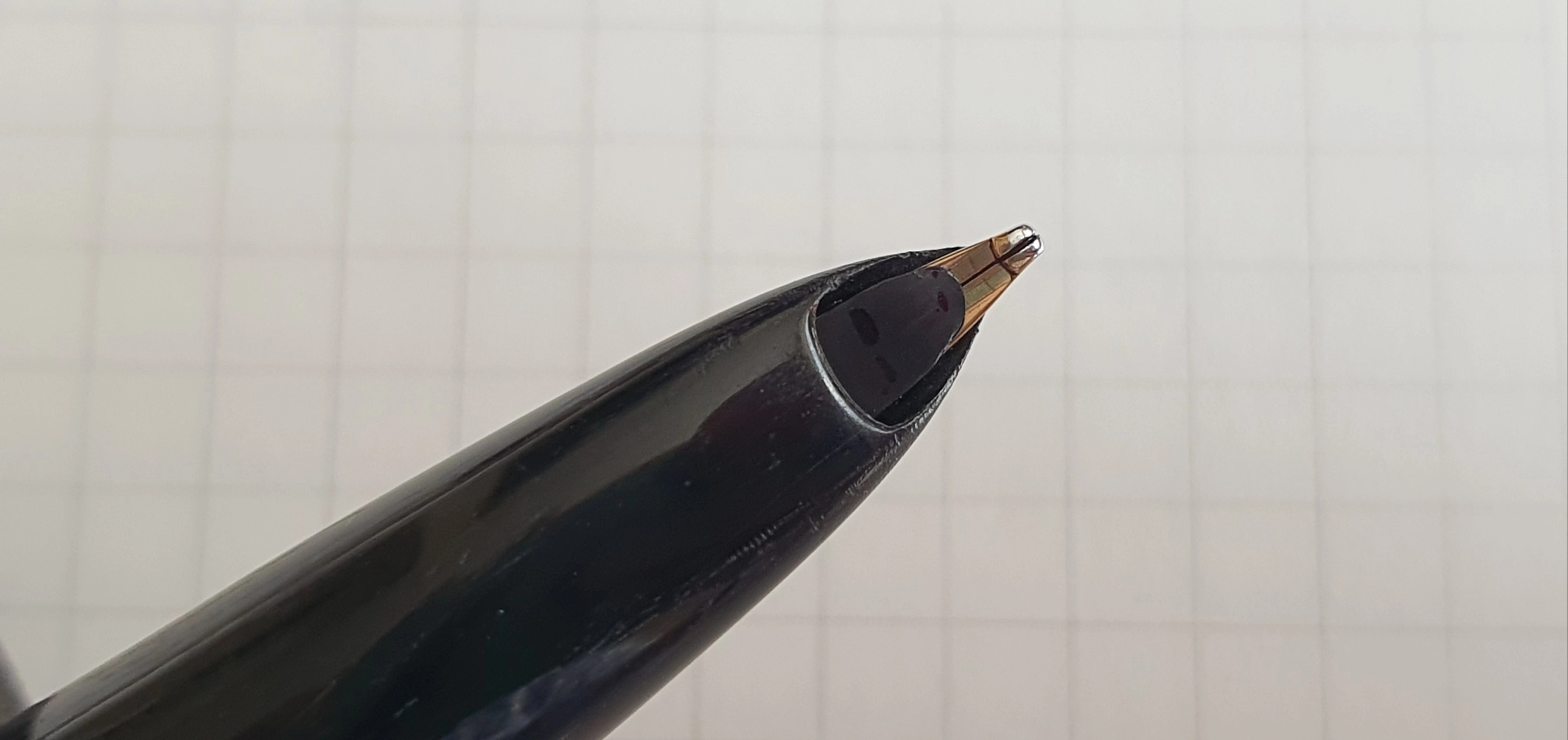 On examining the nib, there was no date code on it. The gold cleaned up very easily. The nib appeared very slightly bent and the tine gap was rather wide, such that the pen was likely to be a gusher. Rather rashly, I squeezed the sides of the nib together, to narrow the tine gap a little, which had the desired effect. After this it was necessary to realign the tines, for smooth writing.