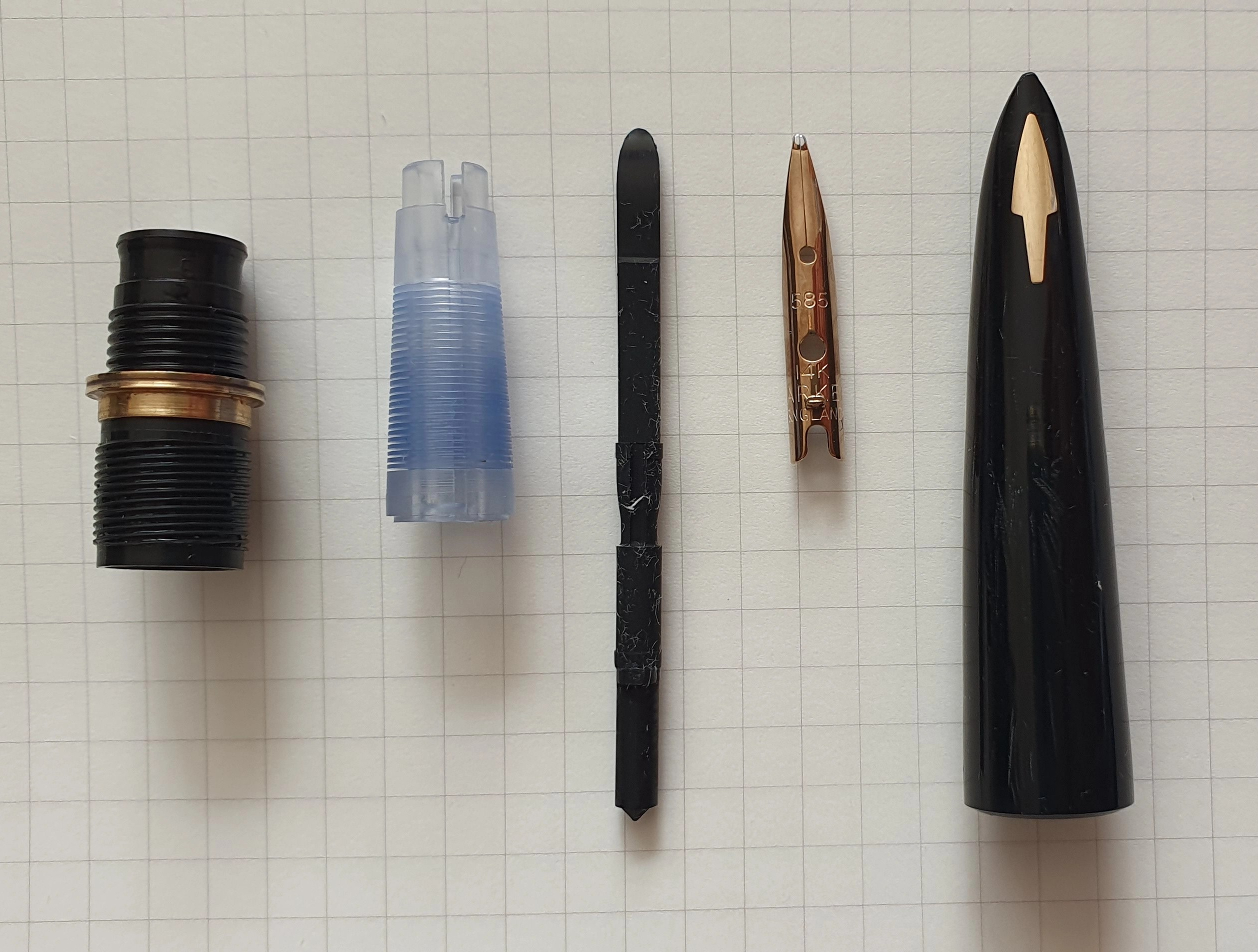 I was careful not to lose any small parts. In my excitement, and after cleaning and photographing the pieces, I forgot the sequence for reassembly and watched an informative YouTube video from Grandmia Pens, which set me right. Steff advises against unscrewing the shell in the Parker 61s, as they are prone to cracking and shrinkage. It is not advisable to apply heat to them to soften the adhesive, (as you might with a Parker 51) for this reason.