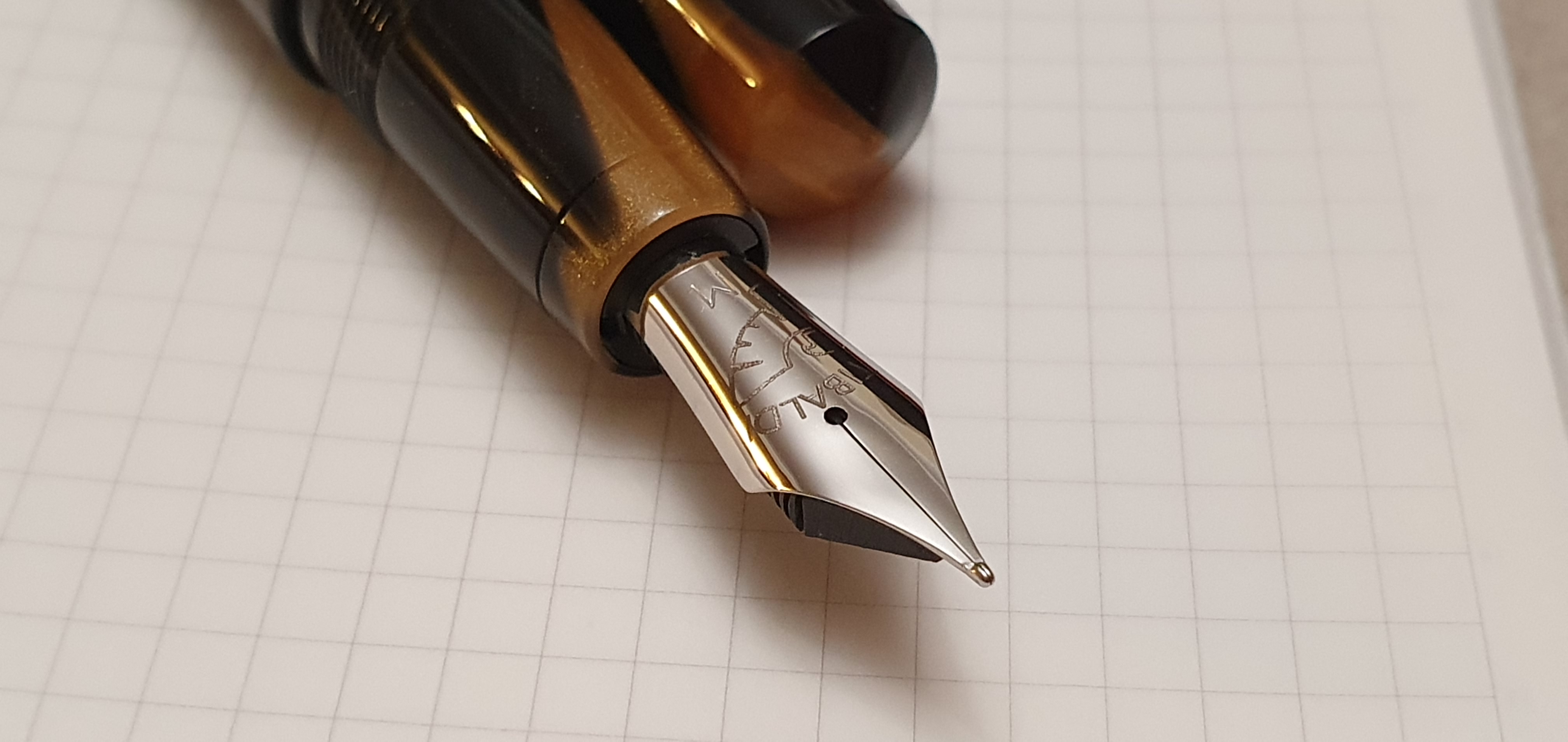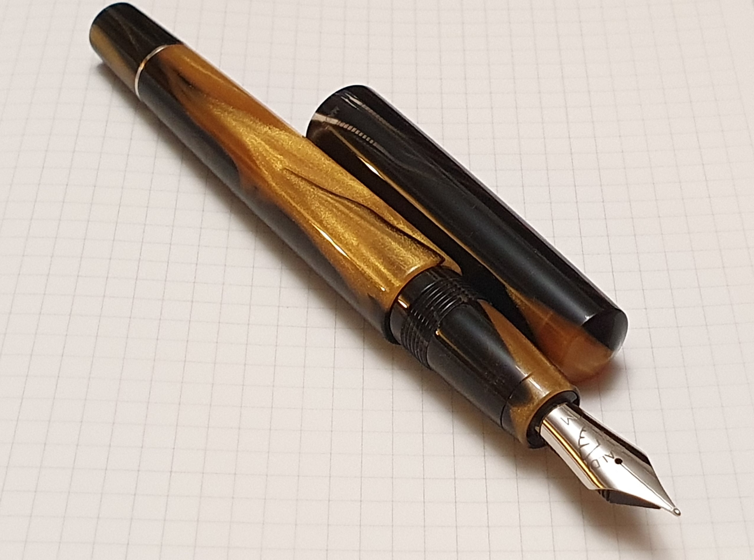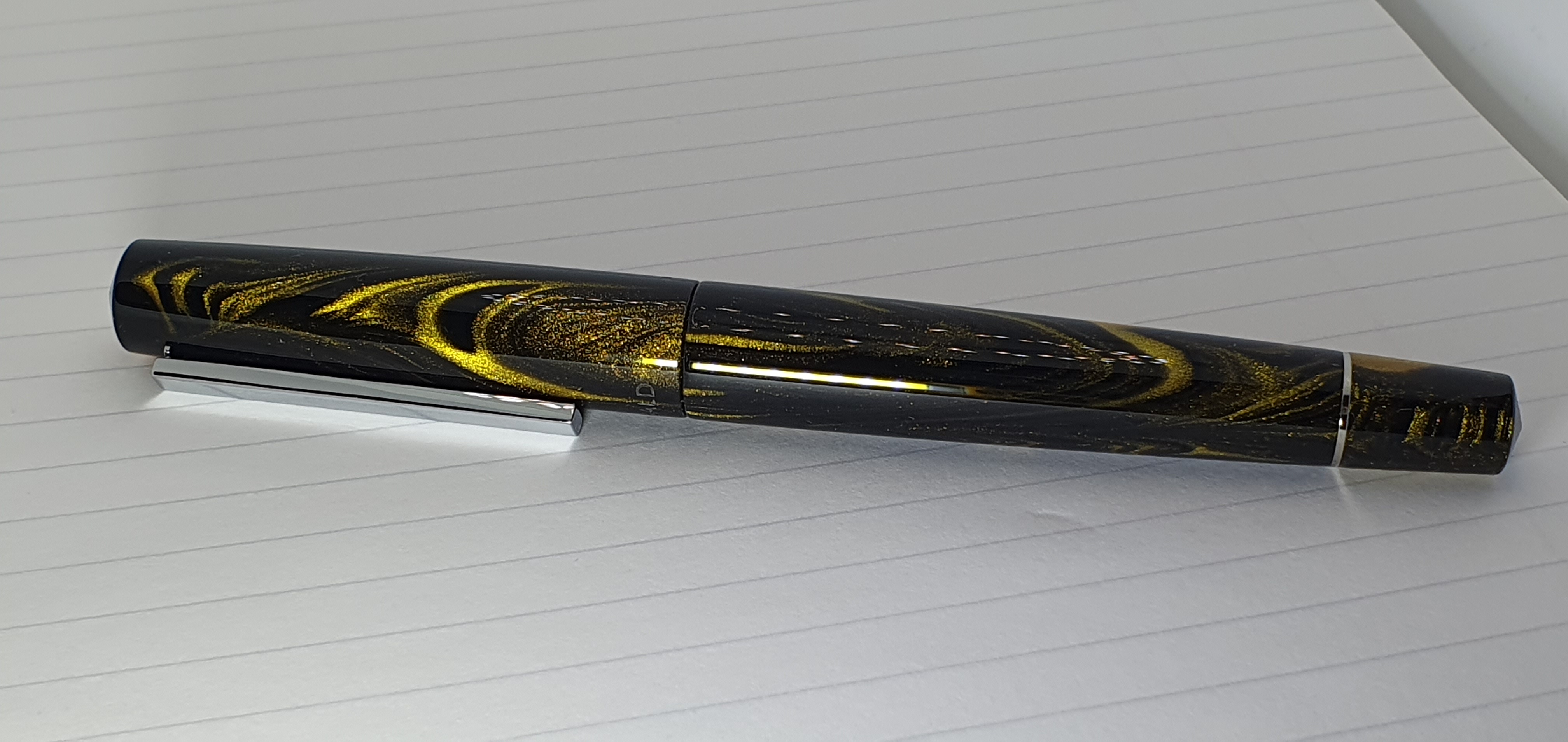 There are ten colour options with this model. This particular version is, I think, called the Black Gold. I say “I think” because I have since seen a similar pen for sale on eBay but described as the “Chrome Yellow Special Edition.” Certainly there is a Chrome Yellow version, but according to photos on the official Tibaldi website, it has the patterned resins in the cap only, whereas the barrel and section are all black. I am not aware of any special editions. The Black Gold, on the other hand, has swirls of yellow in the cap, AND barrel and grip section. I read that they are formed of gold dust in the resin.