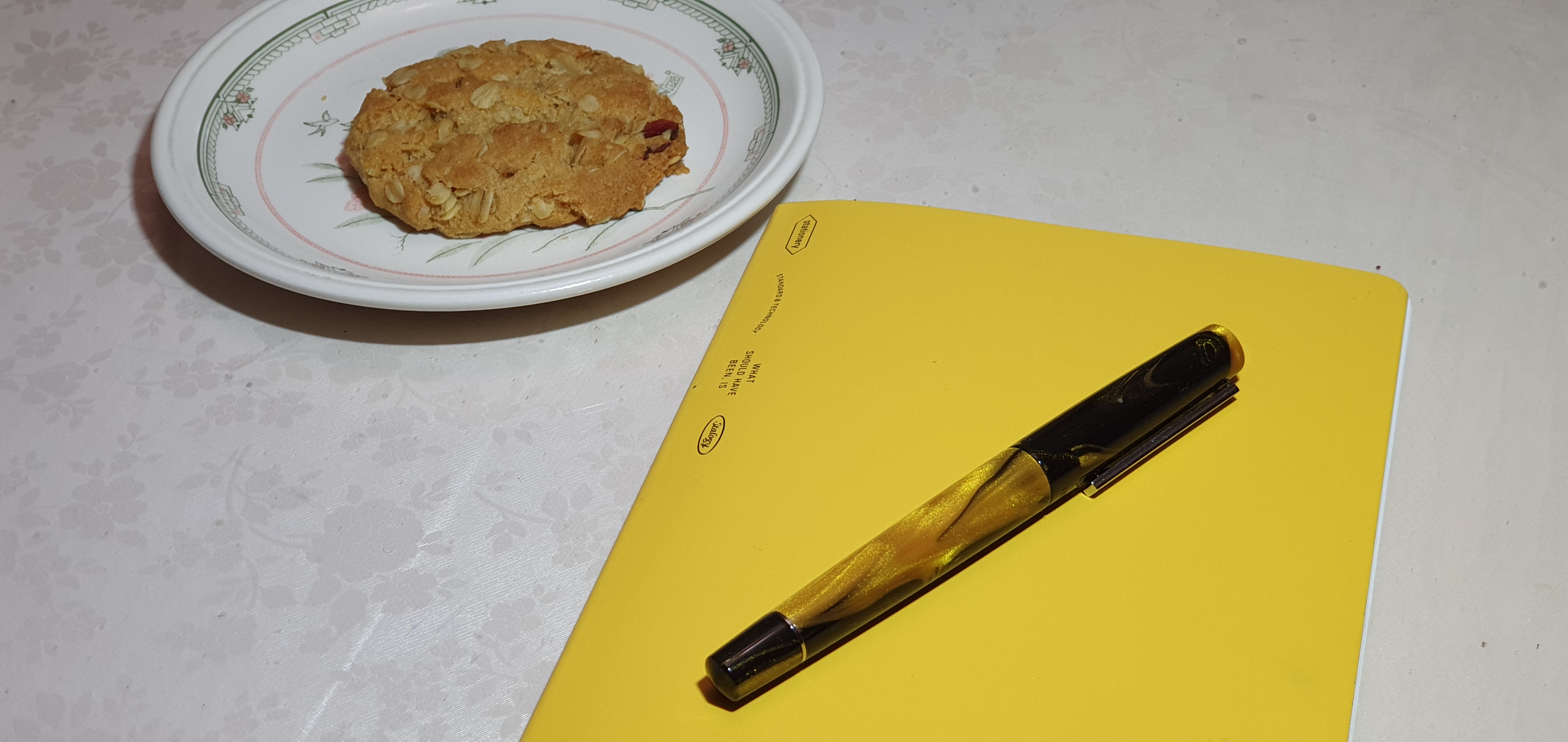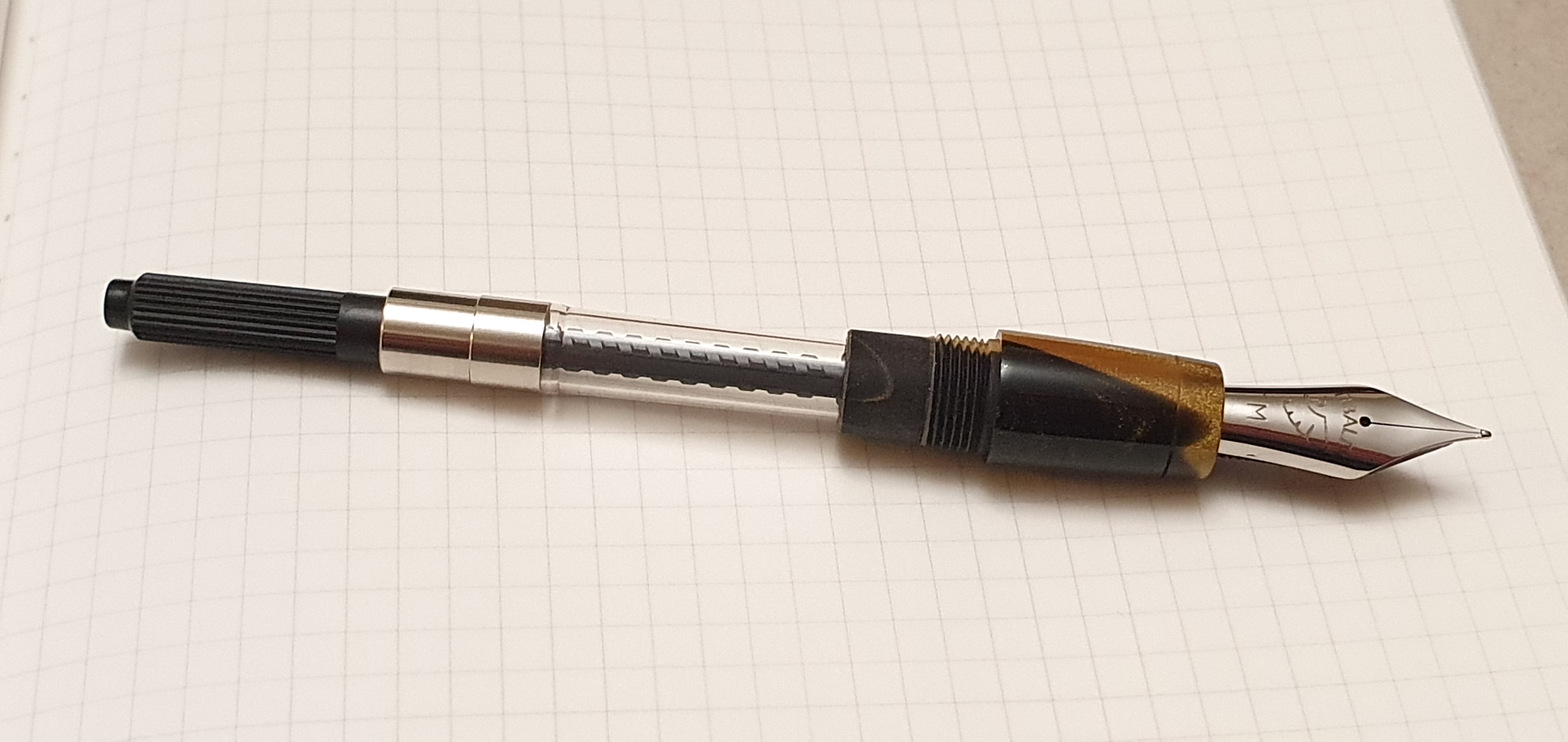 The pen came with a converter and a packet containing one black and one blue cartridge, of the standard international size. I flushed the nib and section and pondered what ink to use. Although I try most new pens first with Waterman Serenity Blue, I decided instead, quite rightly as it turns out, that the pen would like an Italian ink and filled it with Campo Marzio Tabacco, a rich dark brown that flows and shades well.