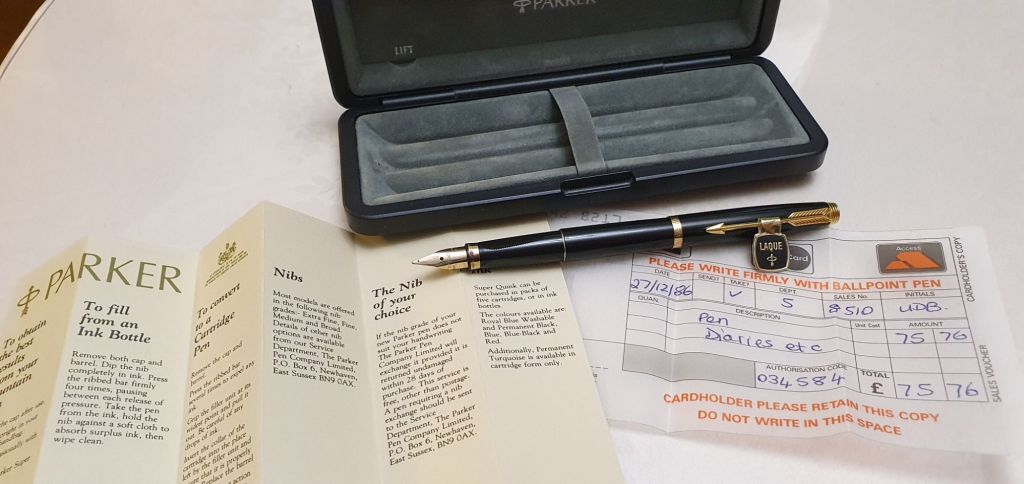 As I still have my old diaries, I dug out my old 1986 volume to see whether I had written anything about the purchase. Sure enough, there was a line near the top of the page (after a reminder to watch the movie “Splash” at 8.30pm), which reads “See about Parker 75 Lacque (sic) £60!?” So, I was aware of the pen and its price and planned to give it another look. Perhaps I had seen it, possibly marked down in the post-Christmas sales.