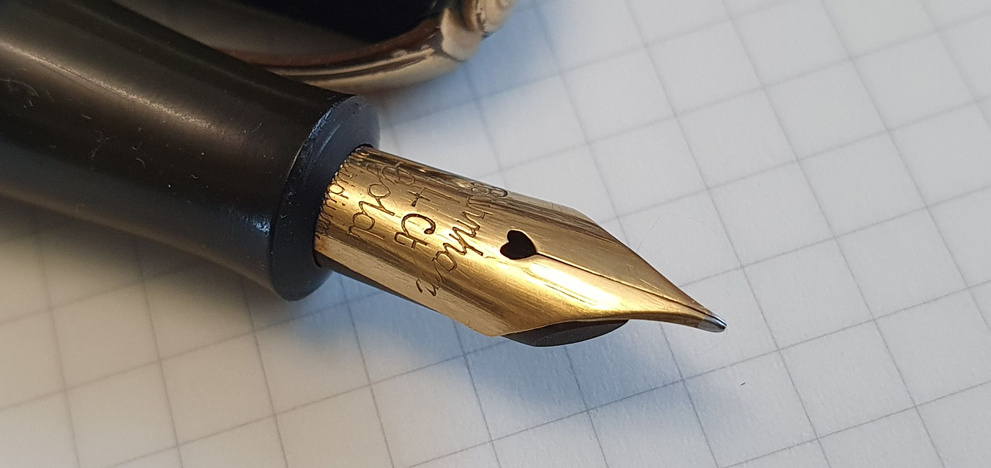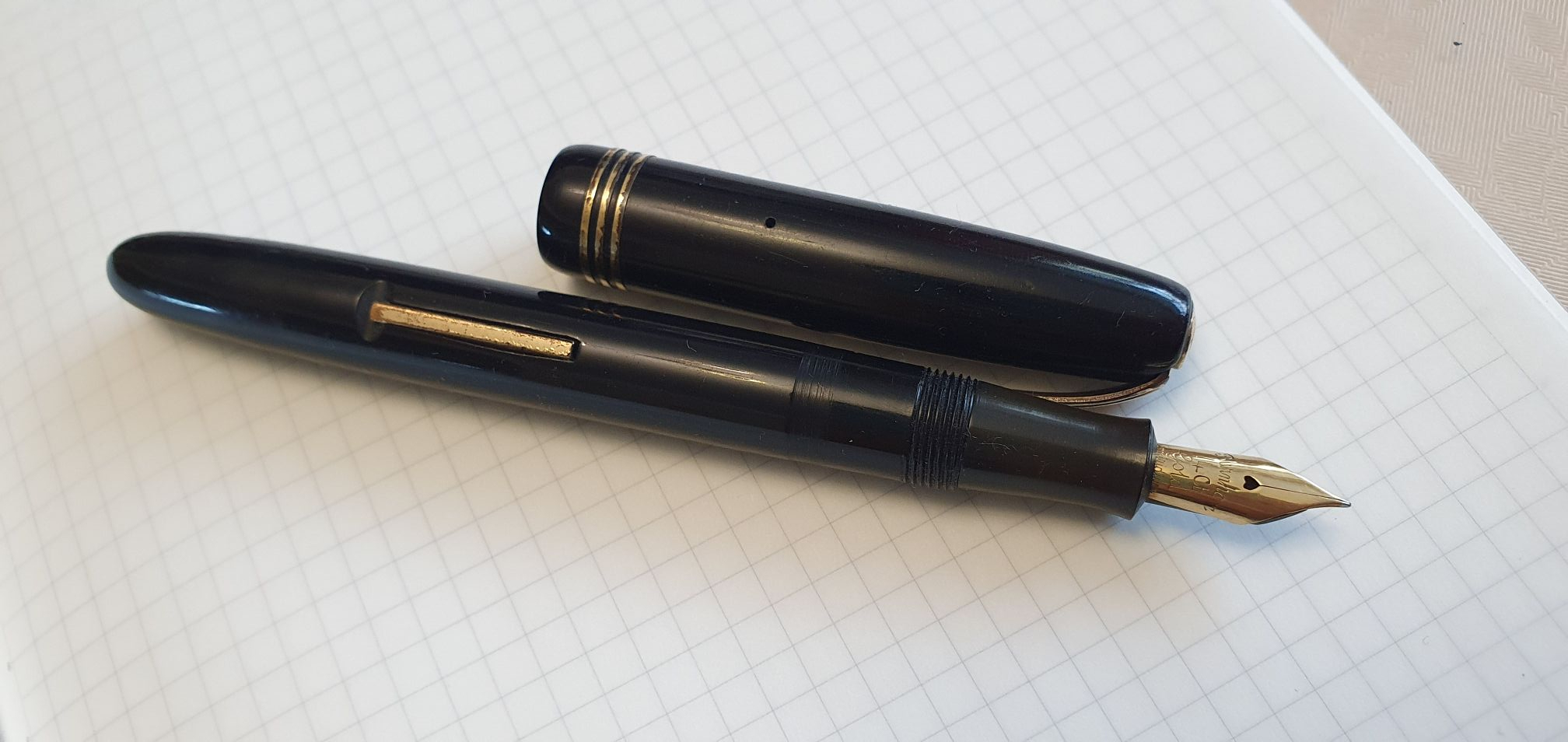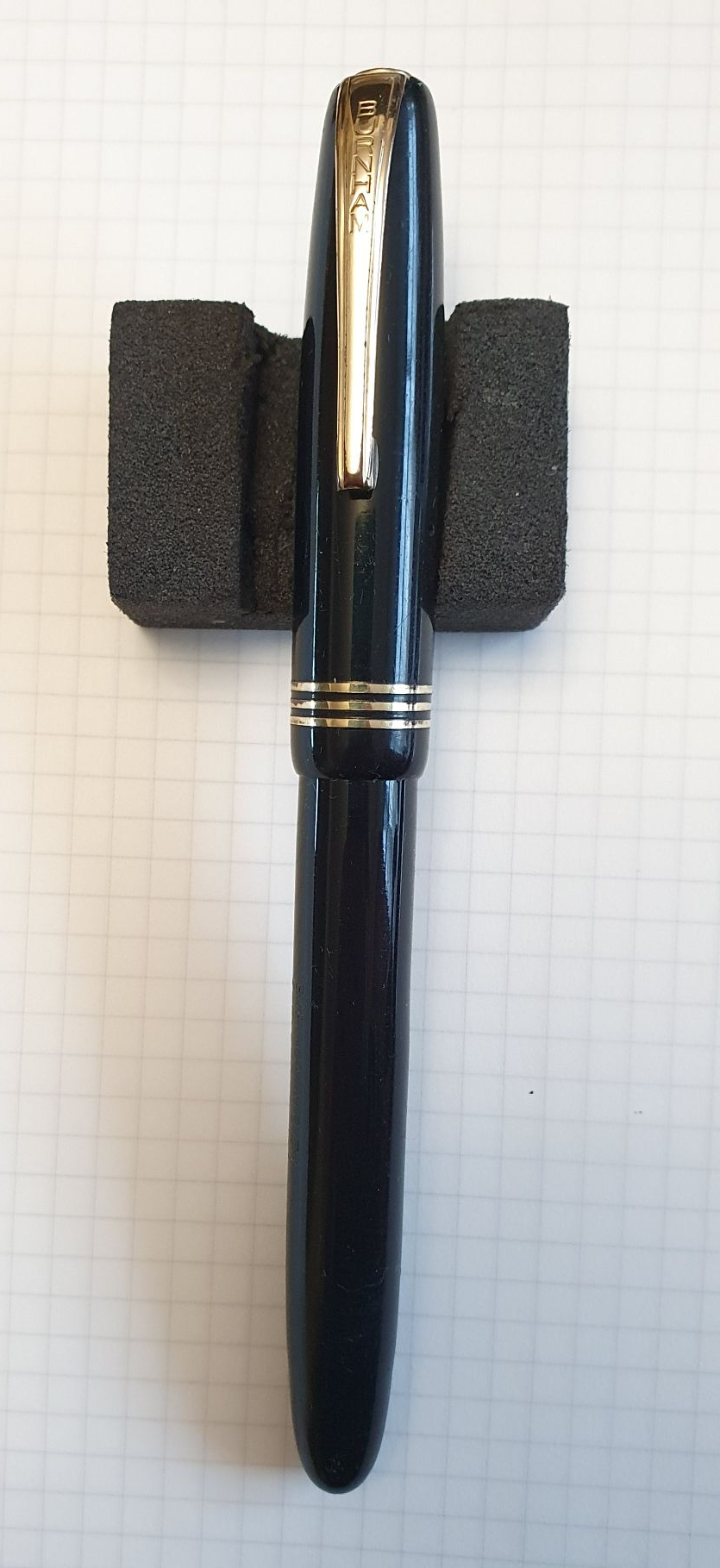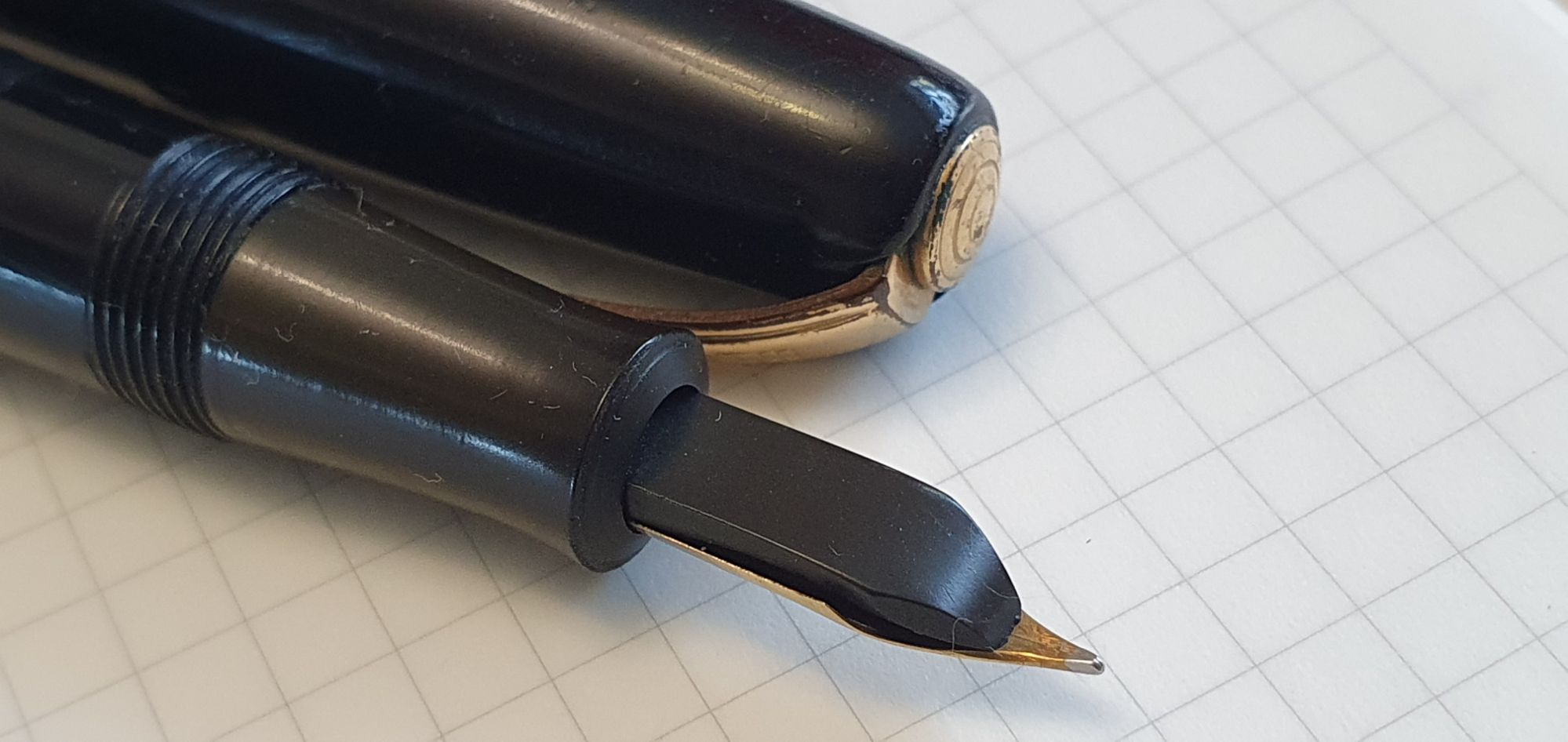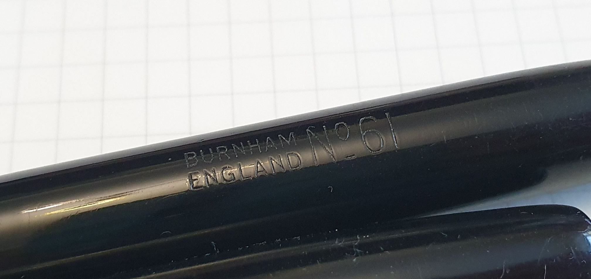 I have been warned by a close relative in my household, to stop looking at pens on eBay as the temptation there is never ending. This, I can confirm, is true. Nevertheless, a decent interval having elapsed since my last transgression, I ventured back to the site and, sure enough, spotted this black Burnham 61 which was offered for immediate purchase. The description stated that the sac had been replaced and that the pen was in good condition for its age. The seller’s photograph of the nib proved too much for me and I was smitten.