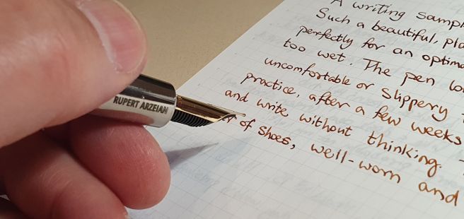 I first filled the pen with Diamine Gibson Guitar series, Cherry Sunburst, a smooth-running warm brown ink with good lubrication. The nib was smooth and firm with just a little bounce. The tines were well aligned with the small gap between them, narrowing until the tipping, just as it should. The nib was nicely centred over the feed. In use, this nib produces a smooth, consistent flow and a line width of around 0.40mm on a down stroke and 0.30mm on a cross stroke.