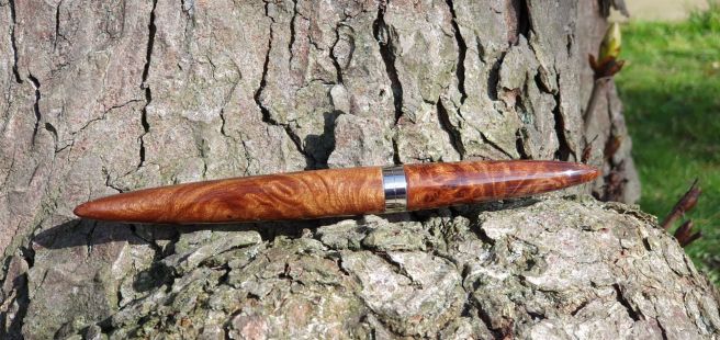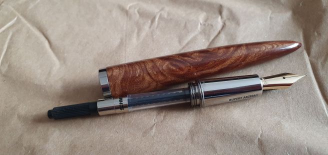 My review pen is of Elm Burl which features a lovely swirling wood grain. Each pen is unique. The finish is high gloss and super-smooth as the process involves lacquering, drying and polishing the pen eight separate times, over a few weeks. The prices of the pens vary according to choice of wood and nib material, my chosen sample being about mid-way in the price range. I was drawn to the Elm, as they were common in Middlesex where I grew up although I remember many being lost to Dutch Elm Disease in the 1970’s. The wood for the pen actually comes from a burl, or burr, which is the gnarled, rounded, growth on a tree typically found on the trunk or branches and formed as a result of stress which the tree experiences. I can relate to that.